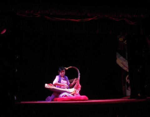 曼德勒木偶剧团成立于1990年,至今已在全世界几十个国家进行过表演,可以算得上木偶戏里的高水平了。剧院不大,大概只能容纳60人左右,但即使这样还是设有除观众席以外的配乐池。大家可以见到缅甸独特的弦乐:凤首箜篌,又被大家称作弯琴。缅甸的提线木偶,结合了本土民俗、国家历史和传统戏曲,配合着独特的音乐,形成了本土具有特色的艺术形式。