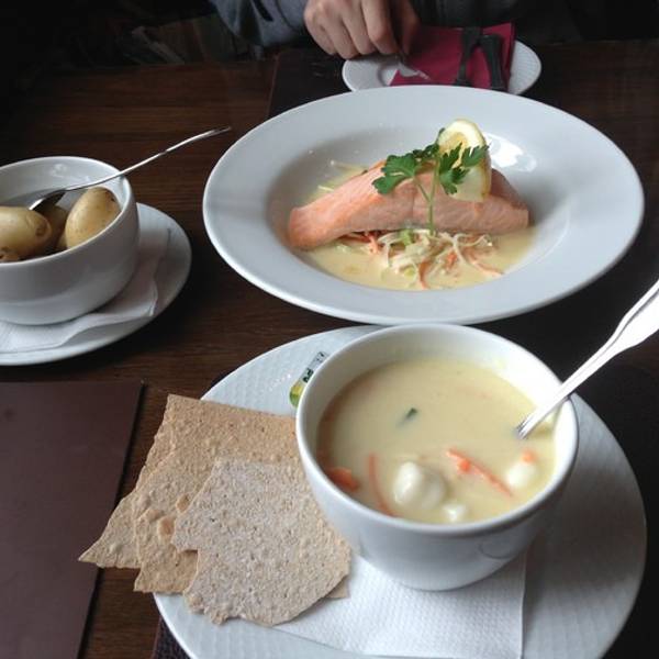 据说是来挪威不可不尝的鱼汤,99克朗,老公点了一个比较安全的三文鱼套餐,对我来说鱼汤很鲜,但是都偏咸