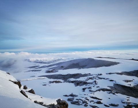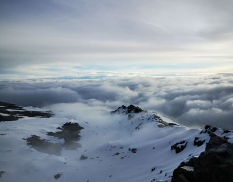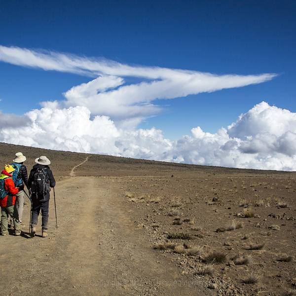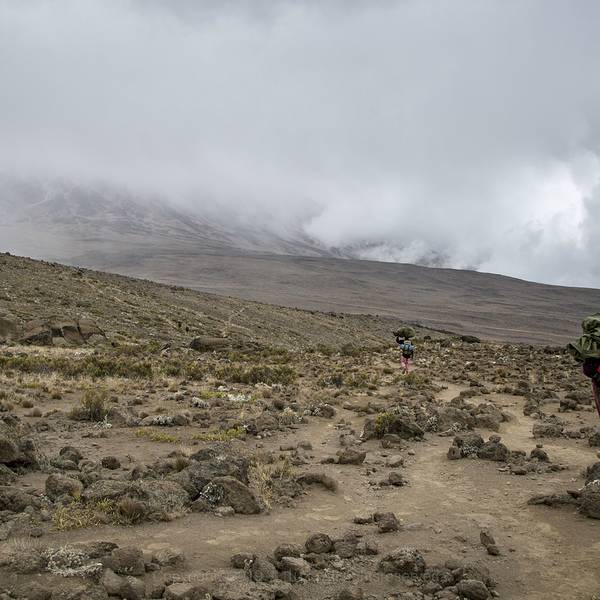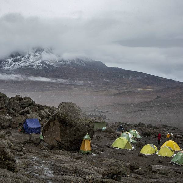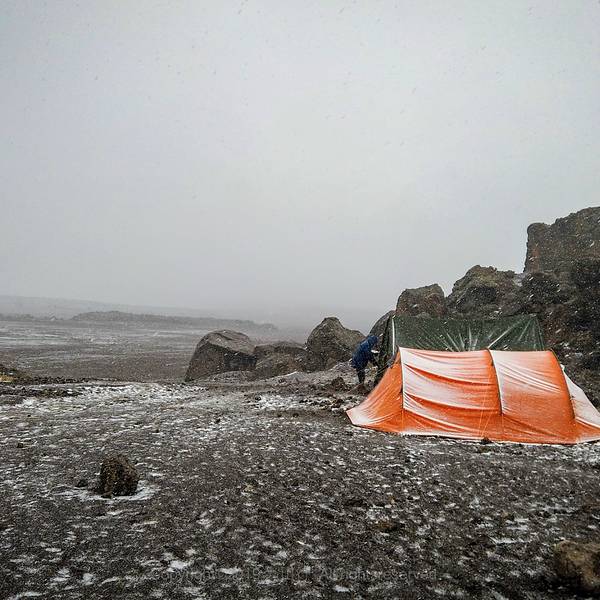 总的来说,这一天行程的风景是非常棒的。试想下,这样的景色怎是一个美字了得乞力马扎罗作为非洲最高峰,是7+2(七大洲最高峰+徒步南北极极点)中最好入门的一座山。因为不需要攀冰、绳降等攀登技巧,这里通常被称为是唯一一座没有登山基础,普通人也能登顶的高峰。但是所谓的简单,永远都...乞力马扎罗作为非洲最高峰,是7+2(七大洲最高峰+徒步南北极极点)中最好入门的一座山。因为不需要攀冰、绳降等攀登技巧,这里通常被称为是唯一一座没有登山基础,普通人也能登顶的高峰。但是所谓的简单,永远都是相对的,是建立在大自然和颜悦色的前提下的,无论是专业登山者还是普通的游客。攀登得越多,心中对于山峰的敬畏就越浓。没有任何一座山峰会被随意攀登,当你轻视大自然时,大自然立即就会给你一个好看。不知道是大自然的眷顾,还是有意和所有登山者开个玩笑,在我们登山的第四天,也就是冲顶前一天,一场暴风雪覆盖了整个山域。七级的大风裹着雪花,挥洒在天际之间。海明威笔下的“乞力马扎罗的雪”,就这么粗暴有力的来了。第四天的行程,是从马文济峰脚下沿着一条长度10公里左右的马鞍形山脊到达基博营地。总的来说,这一天行程的风景是非常棒的。前面就是一直追逐的主峰,身后棱角分明的马文济峰庇护着我们,右侧云海遮住了天际,左侧则是高原特有的植被景色。试想下,这样的景色怎是一个美字了得。不过,在我们还没有开始正式享受美景前,前一天带来云海的季风,却送来了一场暴风雪。霎时间天空阴沉得仿佛披上了一层厚重的幕布,压的人们透不过气来。贫瘠的土地无法提供更多的武器,狂风便卷起大片的雪花,仿佛被染上了颜色般的,在天地间上下翻飞,飘飘摇摇。原本清晰可见的山峰,早已不见了踪影。眼前只剩下了昏黄的大地,肆虐的白毛风和一条弯弯曲曲通向未知的小路。原本闲庭信步的人们套上了包里所有的衣服,低着头加快了步伐,逃跑般得开始了冲刺。原本4个多小时的路程,在暴风雪的帮助下,我们仅用了不到3个半小时,基博营地庞大的建筑群就出现在了我们的面前。一边是五颜六色簇状般分布在大地上的帐篷群,一边则是规划清晰的小木屋。龙盖线和马兰古线在这里完成了线路汇合,马兰古线独有的小木屋也呈现在了我们的眼前。早早的钻进帐篷,换下湿透的冲锋衣,自制的奶茶和可可粉饮料开始温暖我们的身体。吃过午饭,天气一直没有好转,但是营地却变得热闹起来。从马兰古线攀升的队伍逐渐到达,登顶的队伍开始下撤,迎来送往好不热闹。招呼声、欢笑声不绝于耳。另外,基博营地作为最后冲顶的大本营,却是龙盖和马兰古两条线中唯一一个没有水源补给的营地。营地生活用水全部由人工从山下背上来。而今天漫天的飞雪却成为营地最好的水源补给。于是很多营地的工作人员,也自发的加入了欢庆的队伍。原计划这一天的行程是中午到达基博营地,下午休息,准备次日凌晨开始冲顶。但是恶劣的天气让计划出现了第一个不确定性因素:寒冷。帐篷基本上需要1个小时清理一下积雪。气温随着夜幕的降临也急速的下降。如果一直待在帐篷中,很可能因为寒冷影响睡眠,造成次日清晨冲顶不利。为了保持好的状态,在向导的帮助下,我们支付了部分费用,从一室一厅的帐篷搬入了12人上下铺的木屋。温暖的小屋,终于让我们可以踏实地休息了。而屋外,天地间的混沌从上午一直持续到了天黑。大地的白和弥漫在天地间的灰成为这幅画卷的全部色调。恶劣的天气让凌晨的登顶变得扑朔迷离起来。没有人知道雪会下到什么时候,这场雪又会为冲顶会带来什么! 展开