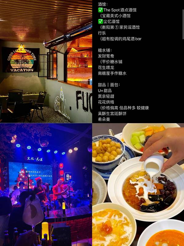 周末不忙,来趟衡阳! 衡阳融冠乐街吃喝玩大合集! ✅咖啡|茶|奶茶: BY CAFE不一咖啡 (暗黑工业风,出片圣地,特调很不错 sip·sip (宅寂风 开心果拿铁惊艳 岚咖啡 (黑白灰+木质 适合拍照 UPHILL种青山茶肆TEA (新中式茶饮 最鸳鸯 (港式奶茶 菠萝油不错 ✅酒馆: The Spot酒点酒馆 (宝藏美式小酒馆 尘忆酒馆 (衡阳第①家民谣酒馆 行乐 (鸡尾酒bar ✅糖水铺: 发财鸳鸯 花生喂龙 南糖屋手作糖水 ✅甜品|面包: U+甜品 莫奈轻甜 花花烘培 吴酥生宫廷酥饼 ✅本地湘菜: 湘见欢 尚宫厨(高端湘菜 刘大厨 衡东樟树园土菜 ✅日料: 炭居合日料 昊来了寿司 ✅东北菜: 老东北铁锅炖 ✅粤菜: 粤盛海鲜楼 粤味轩 香港尚品茶餐厅 ✅泰国菜: 三头象神 泰正·亚洲料理 ✅漂亮饭: 有蜜花园 the season肆計 枫声x酌火 Un融合 余年咖啡轻食 ✅烤肉: 小新烤肉 肉霸霸 欢喜烤肉 ✅夜宵: 唐不二 今夜有局 熊记牛魔王 何哈哈炸串大排档 刘瓦屋·鲜活夜宵 ✅火锅: 山旮旮贵州火锅 猛追兔 二十九栋烂火锅 ✅披萨: BiGA披萨 ✅炸鸡汉堡: 司辰炸鸡、正谈炸鸡、老香港炸鸡、麦当劳、塔斯汀 ✅麻辣烫、卤菜: 杨国福麻辣烫、张十三益阳麻辣烫、淋蔬麻辣烫·麻辣拌、王周周热卤 ✅水果、零食、便利店∶ 百果园、绿叶、蔚觉果物、果发发、零食很忙、戴永红、爱零食、美宜佳、乐街便利店 ✅简餐: 五福小厨 、王记社区食堂、刘刘大顺、住家螺狮粉、隐柒柒、湘卤王、螺狮·茶语、兰州拉面、陈百味、山西刀削面、181猪肉米粉铺、云清季、紫竹林、穆记老潼关、袁记云饺、梁师傅、三津汤包 、鑫隆包子 ✅服饰: Teatoll服饰 (小众原创 萤火虫女装 (平价流行女装店 ✅娱乐: 忆倾城spa 乐满地 南舞西湖 羊不白手工屋 ovo自拍馆 (拍立得自助照相馆 台球棋牌馆 网吧 剧本馆 ✅乐街拍照打卡点: 周杰伦晴天墙 花花墙 粉红衡阳标识墙 ➕ 🟰❤️ 粉红墙 各种涂鸦墙 ✅乐街停车很方便,停车场收费也不贵