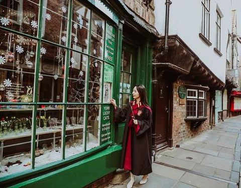 金骆驼 看到这些美丽的花篮,一整天的心情都会是美美的。 真的是很贴心的商店呢在约克市中心,有一条街道叫肉铺街,得名于中世纪街道两边肉铺林立,是约克、甚至是全欧洲中世纪风格保存的最完好的一条街。走在这条街上,仿佛来到了中世纪的英国。这里也是《哈利波特》系列电影中对角巷的取景...在约克市中心,有一条街道叫肉铺街,得名于中世纪街道两边肉铺林立,是约克、甚至是全欧洲中世纪风格保存的最完好的一条街。走在这条街上,仿佛来到了中世纪的英国。这里也是《哈利波特》系列电影中对角巷的取景地。对角巷是隐藏于英国伦敦麻瓜无法看见的破釜酒吧(Leaky Cauldron)后的小天井中,通过用魔杖敲打垃圾箱边上特定的墙砖可以进入的小巷,巫师们在这边可以购买到各种魔法用品,尤其是一年级的新生们,入学必备的魔杖、黑袍、甘锅、飞天扫帚都需要在这边购买。这边的游客还是比较多一些的,小巷里除了各类的礼品店之外,也会有巧克力甜品店,门口会放置很可爱的厨师造型,现场都可以观看如何制作巧克力。这里的每家每户窗口都有放置花篮,很喜欢这样的布置。看到这些美丽的花篮,一整天的心情都会是美美的。值得一提的是,这边也有一家比较大的HarryPotter周边店,里面不仅有常见的魔法袍、霍格沃茨校服、巫师帽、飞天扫帚等物品外,还有各类精致的徽章、玩偶、笔等小型的周边售卖,店里是有中文服务员的,因此完全不用担心语言问题而无法沟通啦~ 真的是很贴心的商店呢!这里的价格与伦敦的专卖店相比相差并不大,偶尔有1-2英镑的浮动,整体来说价格还是可以的。 展开