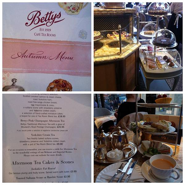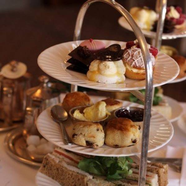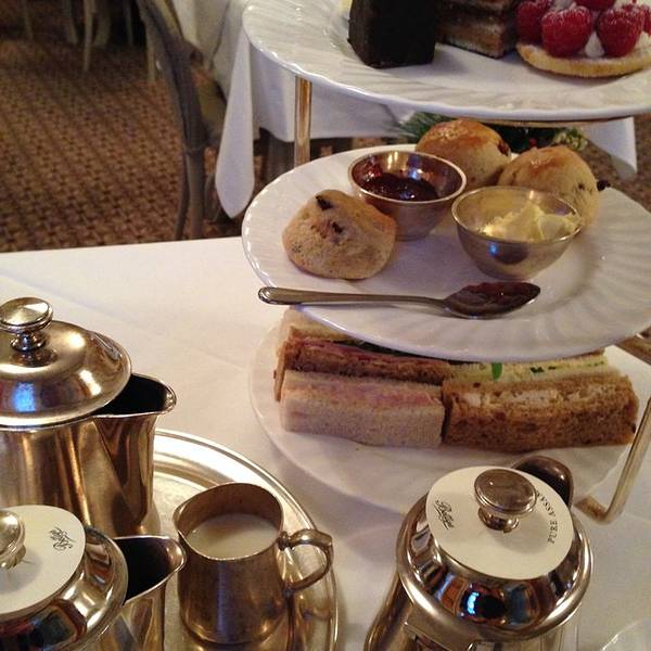 如果是第一次来贝蒂茶室,必然要试试她家的传统下午茶套餐,一壶茶加上三层茶点塔。桌上所有的茶具和餐具都是银制的。三层茶点塔的最底层是小三明治;第二层,热司康饼,并且配着草莓酱和凝结奶油;最上层是各种甜点。贝蒂的司康饼和甜点的马卡龙也是非常有名。吃司康饼一定要配合凝结奶油。这个奶油比一般奶油味道浓郁,质地跟一些软质的奶酪有些相似,丝滑浓郁,入口即化。最后是甜点。甜点的品种常常略有不同,大概和季节有关。经常出现的是马卡龙、巧克力蛋糕加水果塔。