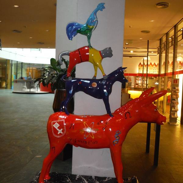 ...在城市的很多地方都能够看到这个雕像衍生出来的各种艺术作品,从下到上这个雕像依次是驴,狗,猫和鸡这个雕像已经成为整个城市的象征了,在城市的很多地方都能够看到这个雕像衍生出来的各种艺术作品,从下到上这个雕像依次是驴,狗,猫和鸡。