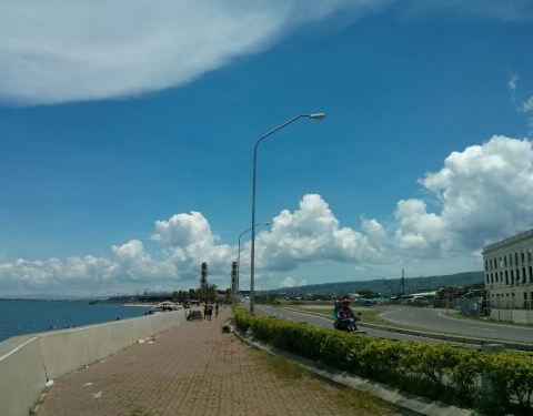 就在海边,闲坐,惬意。蓝天白云。离大教堂不远,都在一块。