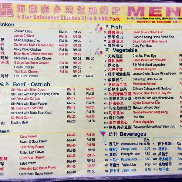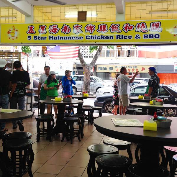【五星海南家乡鸡饭和烧腊】特别满意的一家餐厅。是行程中最棒的两餐之一(之二是吉隆坡的一家印度餐厅且听后续报道)。 我们一共点了四道菜,四份主食,五杯鲜榨果汁冰沙(在马来,鲜榨果汁是必点的,新鲜,好喝还实惠,并且很多热带水果就可以同时品尝到了,我们最爱点的有牛油果,芒果,菠萝,火龙果,杨桃,木瓜等) 每道菜和每道主食都很好吃,味道都很足又各有特色。(最爱是烧腊拼盘,白切鸡和砂煲海鲜伊面,绝对不能错过!)