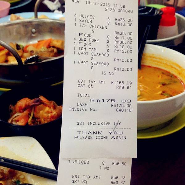 12:50,到“五星海南家乡鸡饭烧腊”吃午饭。点了一个招牌半只“海南鸡”,“烧腊拼盘”。也许本身是广州人,吃多了广东特色菜,没有觉得有多特别。最喜欢的是冬炎(类似冬阴功,但是是面食)。这一顿吃得稍贵,123马币。