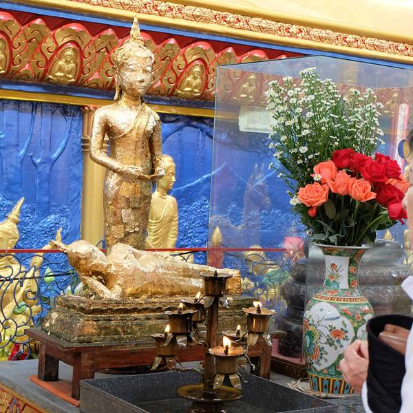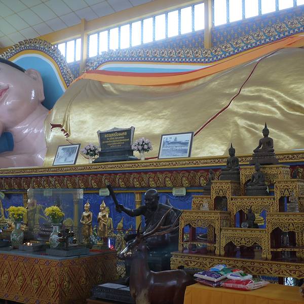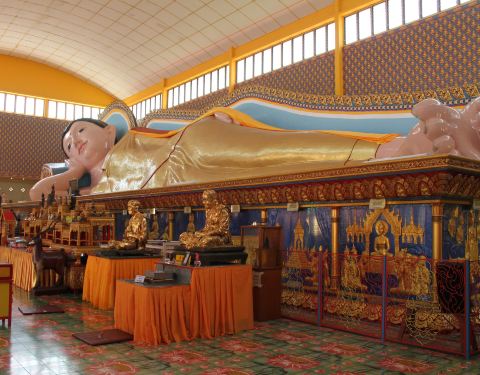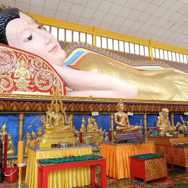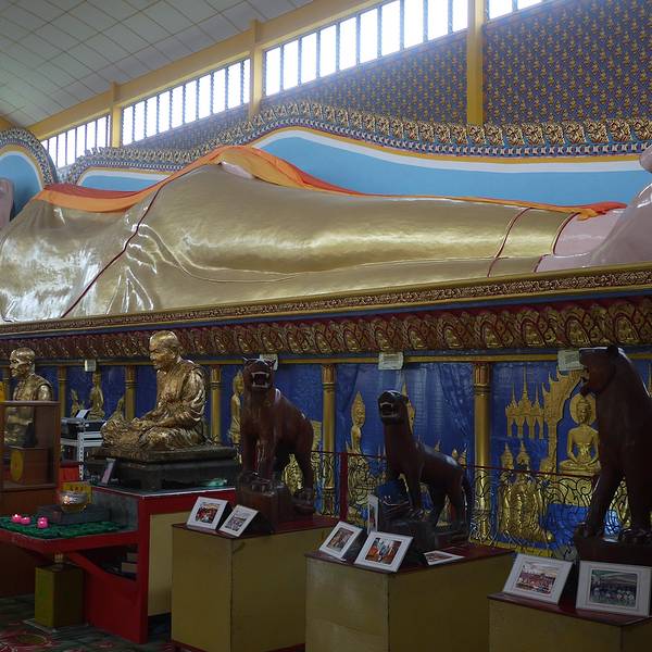位于槟城岛内幽静的住宅区(LORONG BURMA)的卧佛寺,是马来西亚佛教徒必到来朝拜的一个宗教性旅游景点,寺内供奉着一座世界第三大的室内卧佛,卧佛全长33米,很和祥的卧躺在寺庙的大殿里,卧佛身穿金色袈裟,向右侧卧躺着,脚向着右方,脸部慈祥的望着步入大殿的游客们。卧佛的周围还供奉了其他的佛像以及十八尊罗汉像,还有一些泰国高僧的塑像更以金箔贴满,除此之外,卧佛佛台内还有供信徒们放置骨灰,这个卧佛内的骨灰塔是被视为洁净的地方。这座佛寺是建于1845年,是一座过百年的老佛寺。佛寺里的建筑设计模仿了泰国佛殿的建筑风格,而佛寺门口还供奉着两头守护龙,这座佛寺的第一位主持是来自泰国的高僧,佛号PHORTHAN KUAT,据说这位高僧到了槟城岛后非常喜欢当地的一种美食“拉沙面”,随着这位高僧升天后,许多信徒依然都以高僧所喜欢的“拉沙面”摆在高僧的塑像前膜拜。