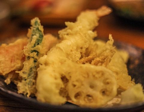 ...里面的座位都是腿盘着坐的,要了三文鱼刺身拼盘,天妇罗做的很好吃哦,炸出来黄金色的,入口脆脆的哦