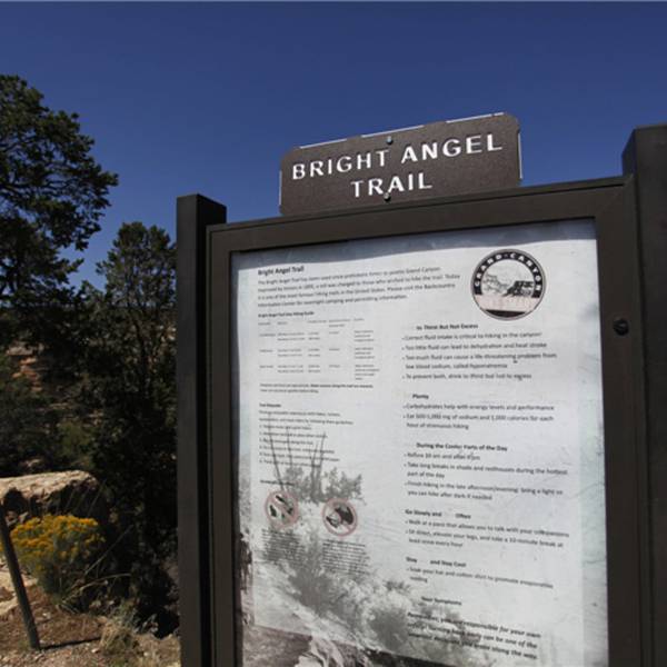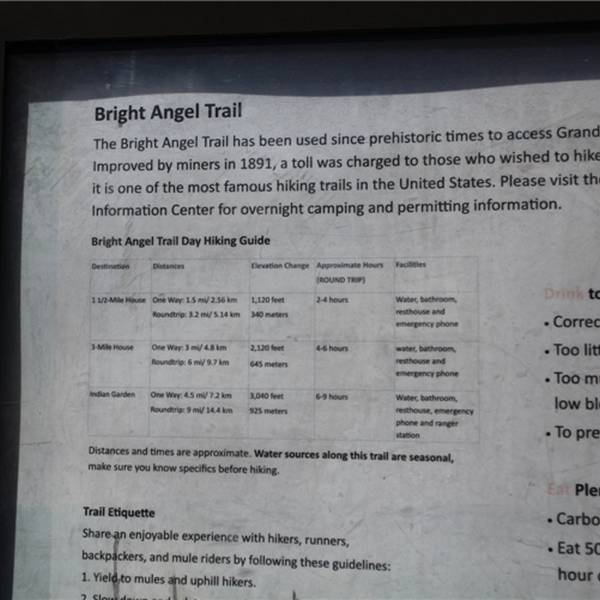 通往科罗拉多河的8英里的下坡路风光秀丽,沿途有四个中转站,这种合理的设计,有效地缓解了白天远足的人的休息需求。这条小道虽然比较陡,但路线长度合适,到“印第安花园”的来回距离也不过14.8公里,落差933米,并且,途中设有洗手间,并供应水,这对徒步旅行者来说,是很重要的。当天来回应该问题不大。第一站Bright Angel Trailhead(明亮天使小道起点,海拔6850英尺);第二站1.5-mile Resthouse(1.5英里休息站,海拔5729英尺,来回4.8公里,需时2-4小时);第二站3-mile Resthouse(3英里休息站,海拔4748英尺,来回9.6公里,需时4-6小时);第三站Indian Garden(印地安花园,海拔3800英尺,来回14.4公里,需时6-9小时);终点Plateau Point(高原点,海拔3740英尺,来回19公里,需时8-12小时)。