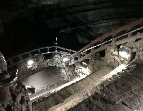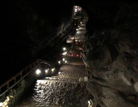 2.下入洞窟的台阶很陡,一定要小心。洞窟地面凹凸不平,建议穿运动鞋行走,地面还有少量积水,洞窟内温度相对较低,最好携带一件轻薄的外套。雨天时请尽量穿雨衣,以免打伞看不清路况。