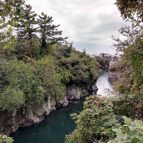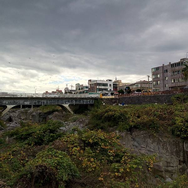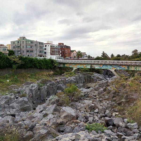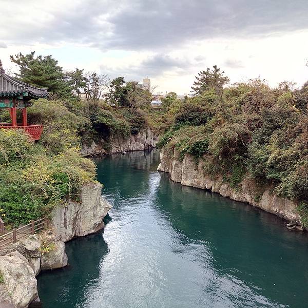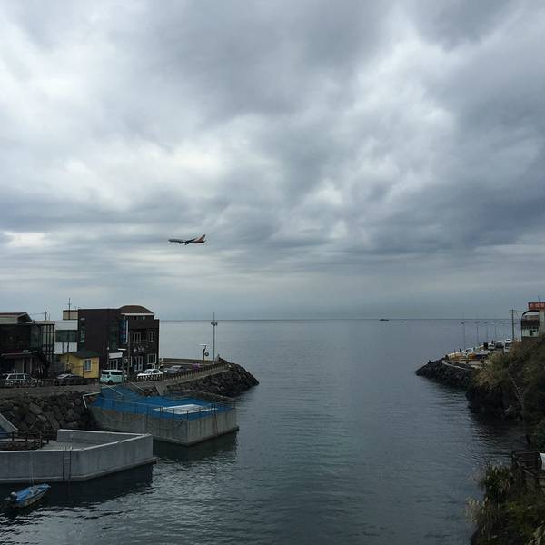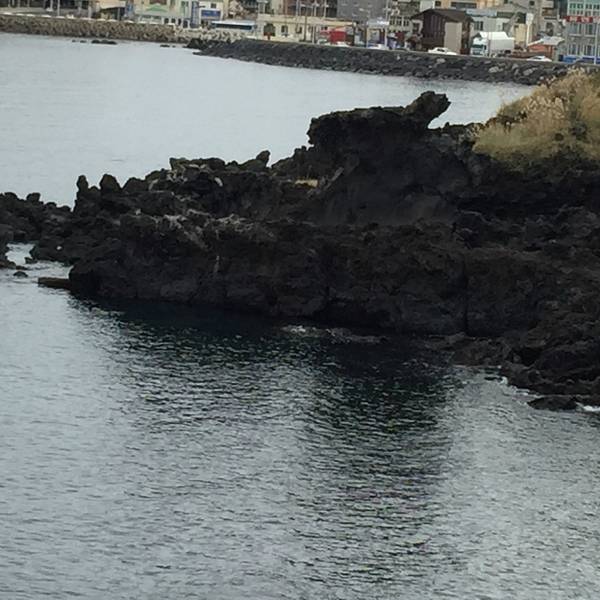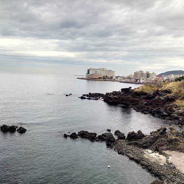 龙头岩是由火山喷发后的岩浆冷却而成,位于济州国际机场的东侧,一般旅行团都会安排这里,因为没有门票,又挨着马路,游览时间10分钟就够了。如果自由行,单独跑一趟我觉得是没有什么必要的。附近的公交不是非常方便,哪里下车都需要步行一段距离,最近的公交站大概是叫做“龙潭交叉口”,下车之后向着海边的方向走,穿过龙潭公园就可以到达龙头岩。点评后半部分我也会对龙潭公园做一个简单的介绍。喏,这里就是龙头岩了,你觉得怎么样?我是觉得挺没劲的,反而是在海边看了半天起降的飞机,基本是一架接着一架,可见济州国际机场的飞机起降密度还是很高的。不夸张的说,在龙头岩耽搁了大概十几分钟时间看飞机起降,便离开了。因为龙头岩离龙潭公园不远,就顺便一起转了转,按照手机导航要走到龙潭公园其实很简单,那个狭长状的公园就是了。龙潭公园也是不要门票的。公园是沿着一条入海的河流而建,环境很清幽,景色也还算不错。只是我们去的当天非常阴沉。刚才提到了公园呈狭长状,所以一直沿着公园向北走就可以走到比较热闹的大路上,一直到这边才可以坐到公交车。我的建议是呢,如果要去龙头岩或者龙潭公园,可以和去济州市的东门市场或者七星路,以及中央地下商城安排在一起,因为这些地方离的都不算太远,从龙头岩走到中央地下商城大概半个小时也是可以走到的,但是一定要会使用手机导航,否则走错了方向可是很麻烦的。