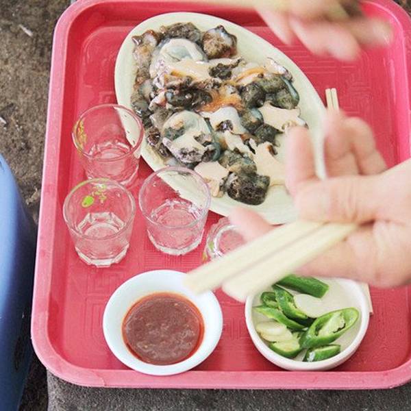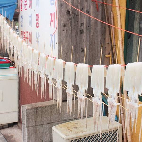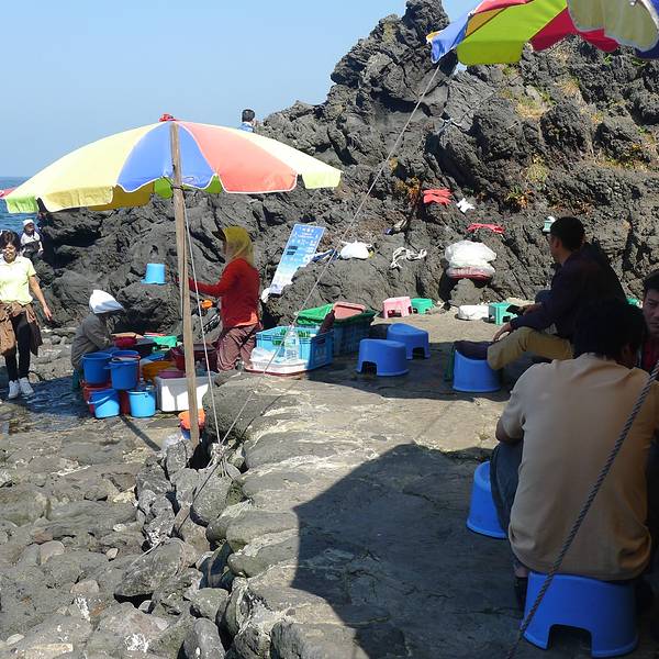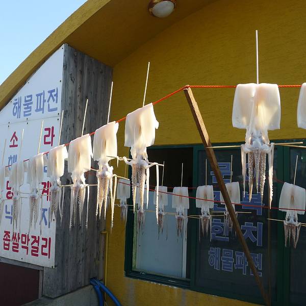 5. 在这片石滩上,有一个吃海鲜的小摊,用大大的塑料盆倒扣过来当桌子板凳,还有韩国人在小摊的大篷里吃海鲜,有活的海参、乌贼、海螺,还有鲍鱼等,都是海女们亲自从海里打捞上来的,味道非常鲜美。