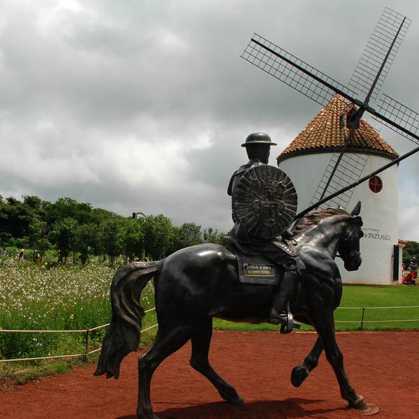 Eco land是目前济州岛唯一一个以火车旅行为主题的大型生态公园,园区内有五部小火车,分别漆上济州岛最具代表性的五种生态色彩,红色代表火山,黑色为玄武岩,黄色是油菜花,绿色象征绿地,蓝色则为蓝天。如果天气好的话,这里一定会很美很美。