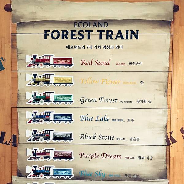 ECOLAND森林小火车(에코랜드)共有五部五个颜色由英国手工打造的小火车,搭复古怀旧的英式森林小火车可以环游汉拏山原始林哦~分5个站,每站下车都有一个主题乐园,玩完以后坐火车移动到下一个站。