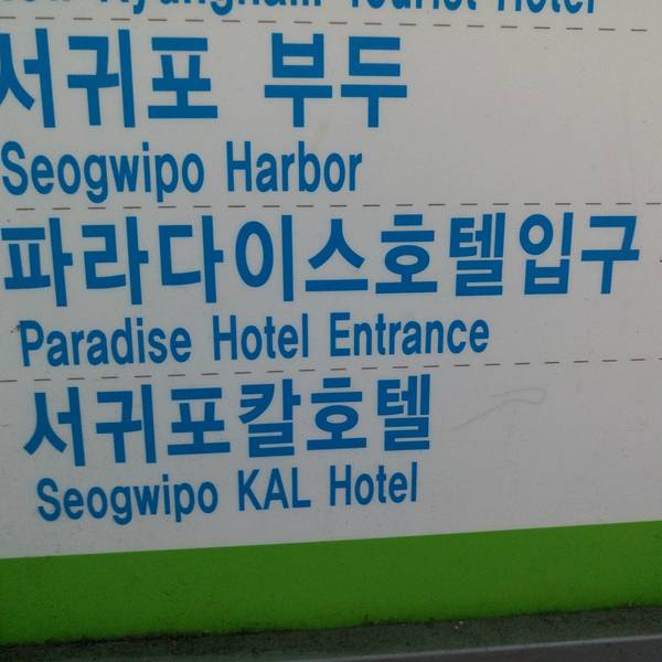 我们去的当天天气并不好,小雨时断时续,如果从济州市或者中文区方向过来,可以乘坐机场大巴600路,在Paradise Hotel站下车(如下图所示,倒数第二站),车上电子显示屏会有中英文的到站提示,下车后往回走,从一个斜岔路口下去走不远就到了,怕走错的话查查手机地图就好了。正房瀑布门口有一个小小的售票厅,门票每人2000韩元,并不贵,大约也就人民币10来块钱的样子。但景区面积也很小,正房瀑布可从远处或者瀑布下方观赏拍照。要近距离接触瀑布可以沿着一片岩石走到瀑布下方,但既然是岩石,就都是不规则的,走的时候一定要小心脚下。我们去的当日可能因为天气原因,游客并不多。