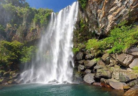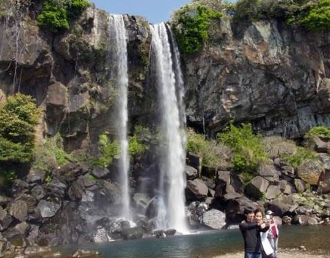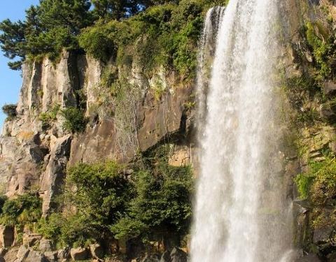 同天帝渊瀑布并称济州岛三大瀑布的正房瀑布,位于济州岛西归浦市东烘洞。它是韩国乃至亚洲直接落入海中的海岸瀑布。 据说,以前有个叫徐福的人奉秦始皇之命来寻找长生不老药,但还是没有找到。回去之前,经过美丽的正房瀑布,在悬崖上刻上“徐福过此”四个字。不过现在已经看不见这几个字了,只是一个传说。另外,西归浦的得名也是取自徐福由此向西而归之意。 由于景点的位置比较偏远,你可以在济州国际机场乘坐600路旅游巴士至终点站KAL饭店,下车后按着正房瀑布的标示牌步行约10分钟即达。景点入口处有个咨询台,有什么旅游的问题可以在这里询问工作人员,虽然不会说中文,但十分热情,简单的英文还是可以说的。 从入口处朝着海边方向走,可以看到一个大的瞭望平台,在这里不仅可以眺望远处的海景,还能将瀑布全景拍摄下来。整个瀑布高23米,宽8米,从黑色峭壁直泻入万顷大海,壮观的瀑布和蓝色的大海欢快地歌唱着,加上周围的垂直峭壁和老松等美景,使这里成为了游客争相合影留念的地方。 若想近距离地接触瀑布,你可以沿着扶梯往下走,走到海岸边,可以直接仰望瀑布。不过,瀑布边都是大石头,很难走,建议穿运动鞋过去。夏天的时候还可以脱鞋淌水玩。如果碰巧你还可以遇到出海的海女,花一点钱就可以吃到她们新鲜打捞上的海胆、乌贼鱼什么的。 从正房瀑布往东走300米,有10个5米高的水流,那就是小正房瀑布。夏天这里是非常受当地人欢迎的戏水场所。