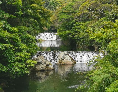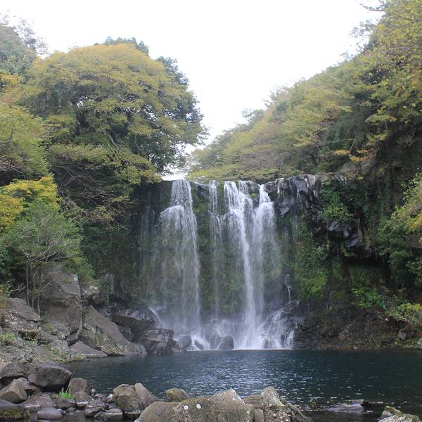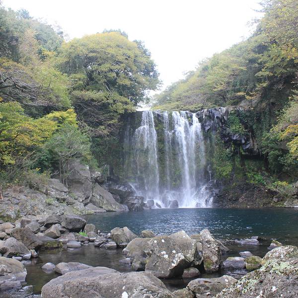 天帝渊瀑布位于济州岛西归浦市,奇岩绝壁高耸入云,瀑布从黑色熔岩的悬崖峭壁上发出雷鸣般的声音倾泻而下,宛如自九天落下的银河。相传是玉皇大帝的七仙女下凡游玩后给这个瀑布命名成天帝渊。天帝渊瀑布高22米,水深21米,整个瀑布分为三段。瀑布周围风景优美,是济州岛保护自然原形的标本地区,因此在该地区禁止垂钓和收集植物等破坏生态环境的一切活动。每天前来这里观光的旅游者络绎不绝。景点本身比较小,瀑布也远没有国内一些同类型的瀑布来的壮观,不过好在周围景色还算不错,植被也被保护的非常好,游客不多,非常安静。从景点入口进入之后会先来到天帝楼前的一片空地,这里有一块白色的七仙女石碑,旁边是五福泉喷泉,往里投入钱币据说会来带好运,五个不同的面上有五种不同的动物,可以祈求财富和健康等。再往里走,穿过高高的仙临桥,它驾在第二、三段瀑布中间,是以鹊桥的形式形成的铁制拱形桥,南北面刻有七仙女的雕像,桥本身较陡,上坡需花一些力气。你可以在桥上合影留念,眺望瀑布或远方的大海。过桥之后左手边沿着石阶下去就是天帝渊瀑布。瀑布的第一段是渊池,只有在大雨天,上流河川的水流下来时,才形成瀑布,平时是看不到瀑布的。因此游客经常去拍照留念的都是第二、三段瀑布。第一至第二段瀑布大约有300米,大部分都是石阶梯。第二段瀑布是从第一段瀑布流下来的水形成的,倾落下之后汇成了一个池子,池水非常清澈。游客现在只能在瀑布前的一块平台上拍照留影,而不能进入瀑布游泳。第三段瀑布至第二段大约500米左右,这里多数是木制阶梯,而且比较陡,游玩时要小心。基本上游览这两段瀑布的时间大约为半小时左右。瀑布的周围,茂密的常绿树和花草随着季节的变化形成另一道美丽的风景线。天帝渊的水形成一条小河一直流到西归浦港。这里冬暖夏凉,夏天来游玩十分舒服。此外,每年五月这里都会举办盛大的七仙女庆祝节。