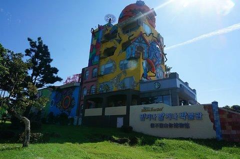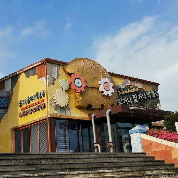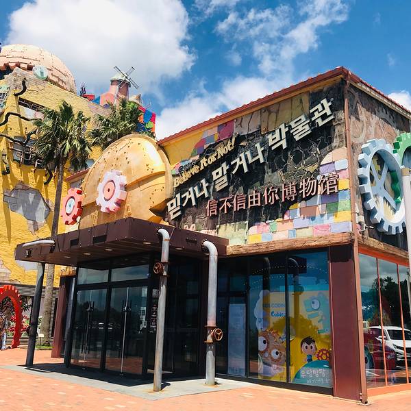 信不信由你博物馆以探险家罗伯特·里普利的精神为中心而设立,展示了他在环游世界时收集到的千奇百怪的物品以及用来记录奇闻怪事的仿造品。在全球开设了多家分馆,是世界上较大的娱乐连锁博物馆,也是《Miss Ripley》的取景地。济州这家里面有一小块德国统一时推倒的柏林墙壁、从火星飞来的陨石块、令人毛骨悚然的中世纪地下监狱等,看过后也不知该不该相信,很不可思议。所有展品背后都隐藏着精彩的故事和背景,对于儿童、青少年甚至成年人都是体验丰富多彩世界历史的好地方。各种展品在世界多地循环展出,因此每次到访都会有新鲜感。从外观上看,博物馆的卡通造型显得十分诡异,建筑共2层,包括12个展厅及室外空间。进入博物馆大厅,你可以看到南瓜马车小船,据说曾在威尼斯大运河上运行过;还有会唱歌的蜡人乐队和世界上较小的汽车。依次参观各个展厅,可以看到猫王的头发、带有黄金鼻子的男人、世上较高大的人、24K镀金跑车、西藏的人骨衣服、鹌鹑蛋画像、鸟笼里的小矮人等,还能体验有趣的旋转隧道。你还可以与一些展品进行互动,例如把头伸到玻璃罐子里,与旁边的“人头罐子”来合照;或在死刑犯受电刑的场景旁按动按钮,犯人就会抽搐并惨叫。博物馆外面有两颗椰子树,你可以将拇指贴在上面许愿或祈祷爱情的永恒。