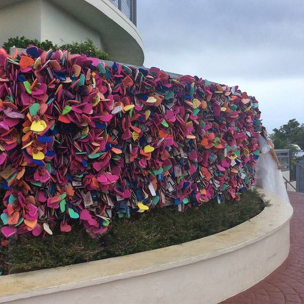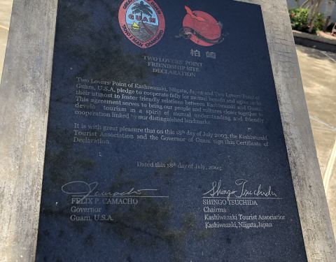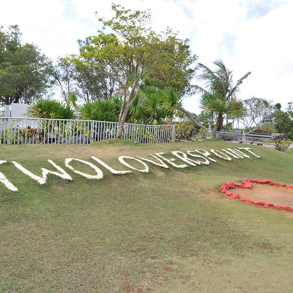 情人崖又称为恋人岬,位于关岛的北部地区,据说曾经有一对情人因家人反对他们结婚,而在此一跃而下殉情自杀。而如今这里是一处看山看海、风光明媚的观景点。情人崖公园情人崖分为两部分,一部分是情人崖公园,在公园的入口处是一个心型的花圃,这里是不少情侣拍照留念的热门地。关于那段凄美的爱情故事,在情人崖上可以看到以五个石碑作画的形式展现出来。石碑分别用了英文、中文、韩文、日文四种版本。夜晚在石碑上还会打上灯光,别有一番风味。观景台情人崖上有一口钟,据说情人们只要到此一起敲钟,便能相爱到永远。而另一部分就是有名的观景台。观景台上有一处白色小凉亭,站在小凉亭内可以远眺整个杜梦湾,从高处俯瞰关岛海岸线。远处,可一览半月形杜梦湾令人着迷的白沙海滩。小凉亭下方有面彩色墙,不少恋人在此留下爱的誓言。纪念品店从观景台下来回到情人崖公园内,这里除了介绍爱情故事的石碑外,还有一些贩卖纪念品的店家,店家除了卖关岛纪念品,也有卖冰淇淋、饮料之类的小东西,其中比较特别的是一种小吃是椰子水加萨西米。萨西米指的是椰子肉,这是当地的独特吃法,将椰子肉淋上酱油跟芥末,口感与生鱼片有异曲同工之妙。情人墙此外,你也可以在纪念品商店购买“爱心留言牌”,在留言牌上留下自己爱的誓言,然后挂在店外的墙壁上。当然,也有些人是放的是照片,还有人把结婚的婚礼名片也放了上去。如果你是傍晚时分来到这里,除了欣赏到美丽的杜梦湾之外,还可以欣赏到壮美的日落。
