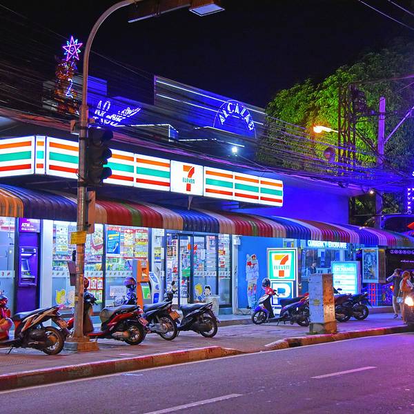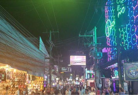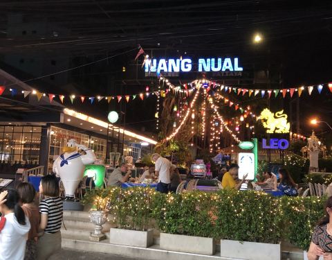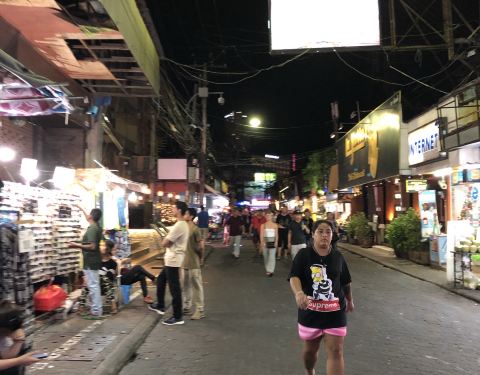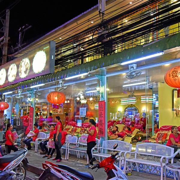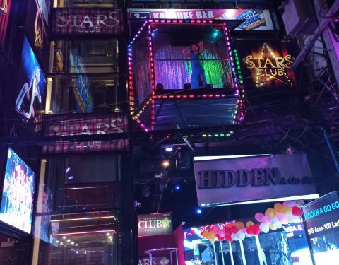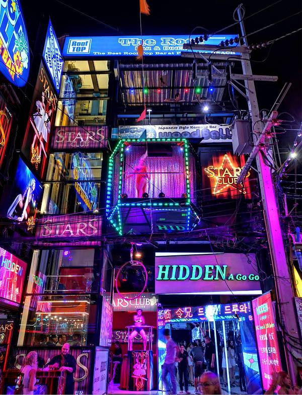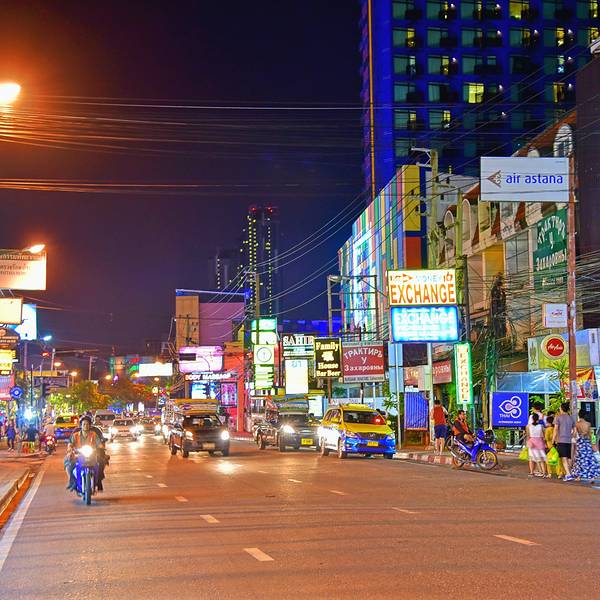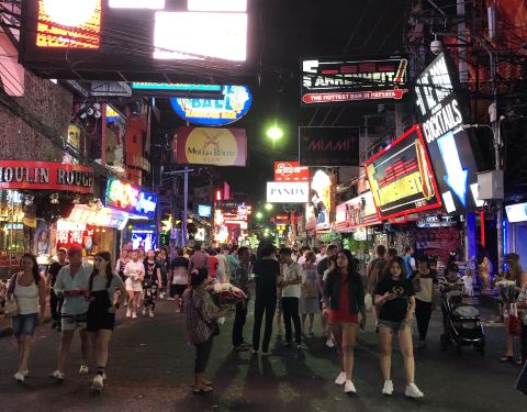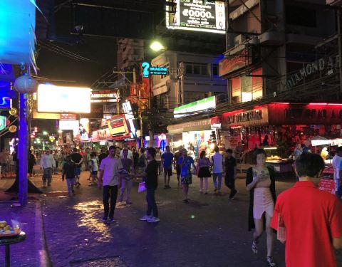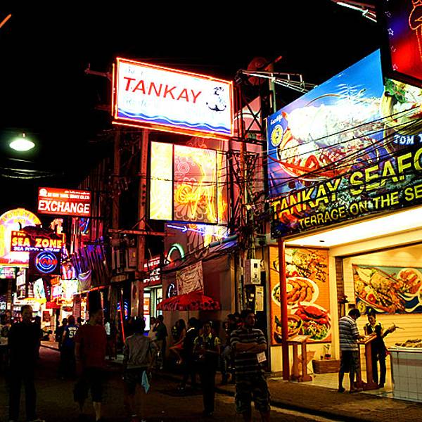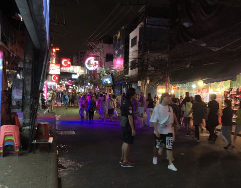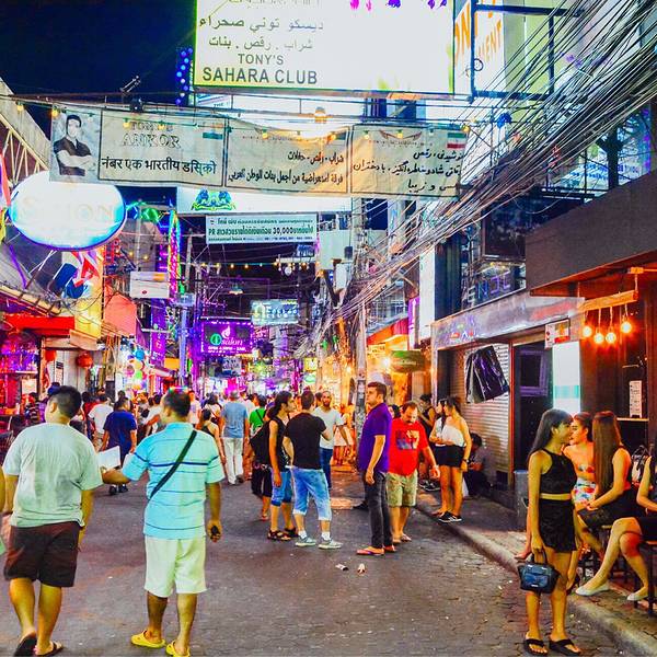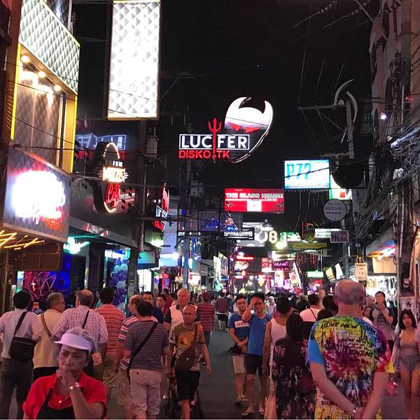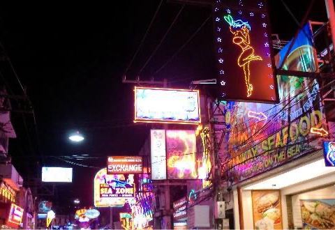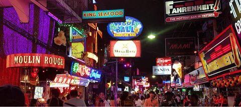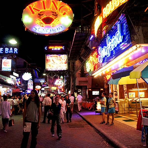 芭堤雅风月步行街两旁有各式小吃、酒吧,街上熙熙攘攘。在这里可以吃到便宜的海鲜大餐。酒吧中经常有音乐表演、泰拳表演。 以霓虹灯和热闹程度论,这里可能远不如国内的一些知名步行街。两旁的电线杆和凌乱的电线,表现了街市建设的随意性。白天相对冷清,但一到晚上灯火通明,夜夜笙歌,还有很多Lady boy在跳舞,招揽游客,光怪陆离、无奇不有,这里是个一刻也不宁静的嘈杂世界。