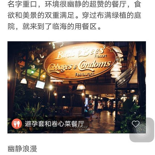 休息了一会儿、晚上去walking street喝酒去!晚餐是去Cabbages&Condoms Restaurant解决滴!餐厅好远,加上google地图滴坑人程度,我们开了1个小时左右才找到这家餐厅...这家餐厅以特别著称,不仅仅因为名字,也因...