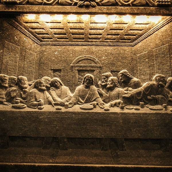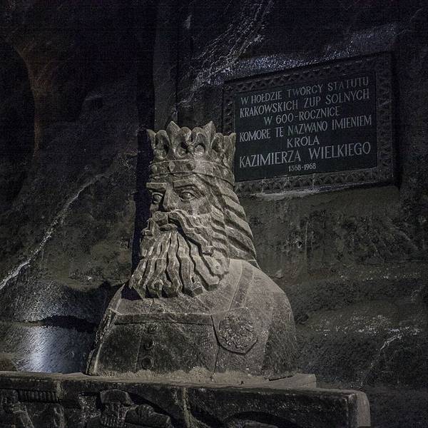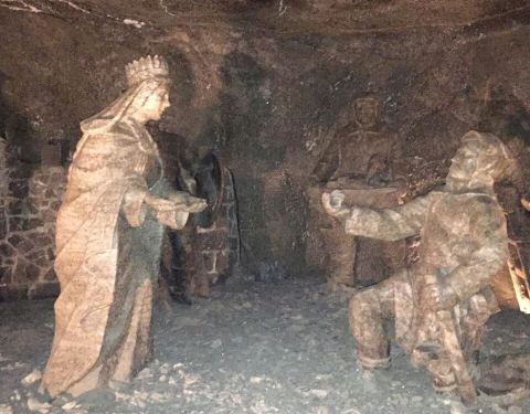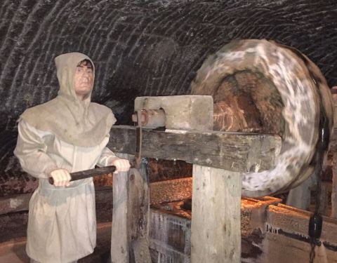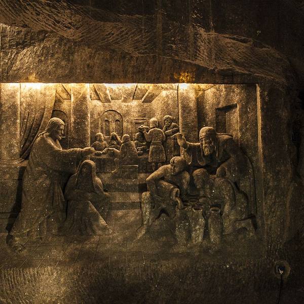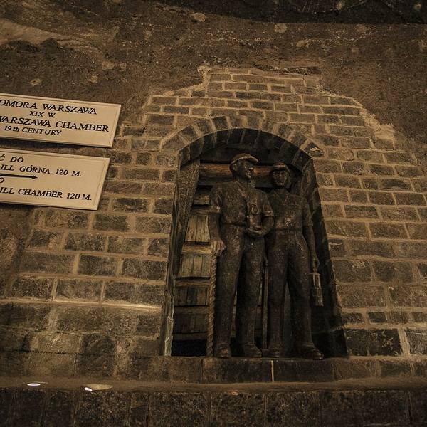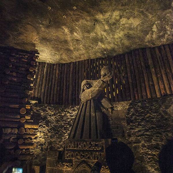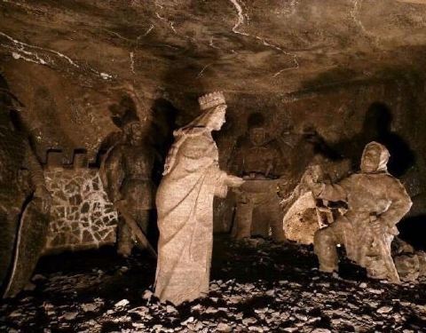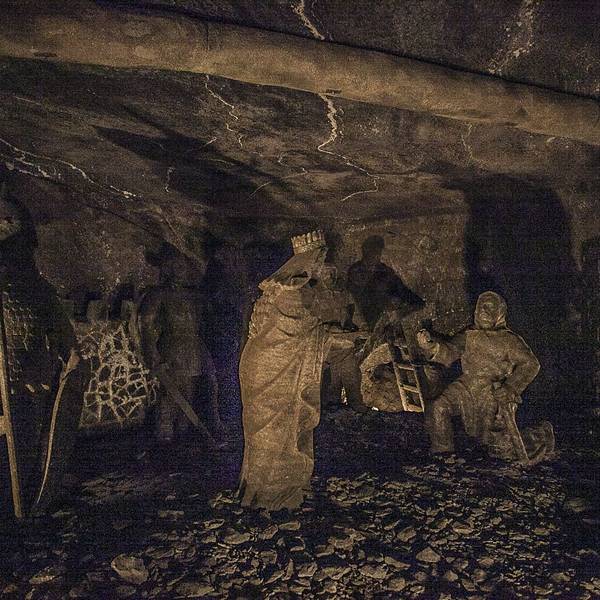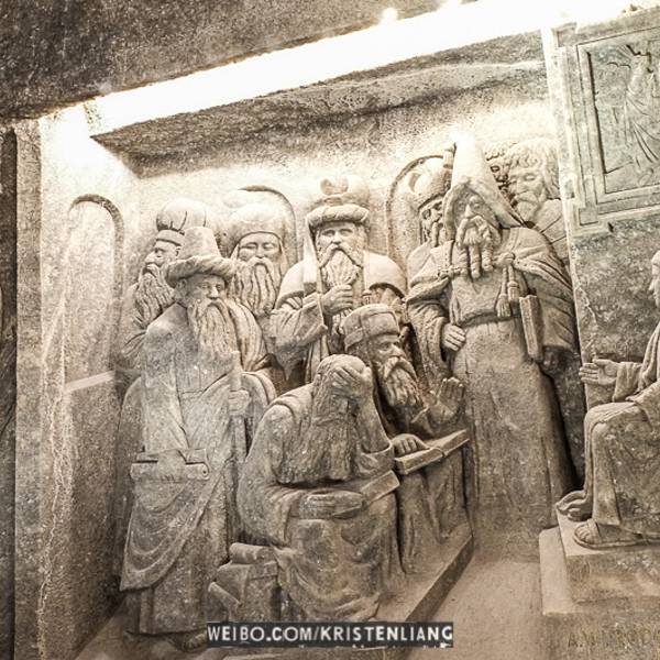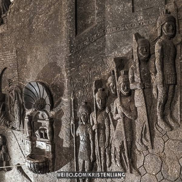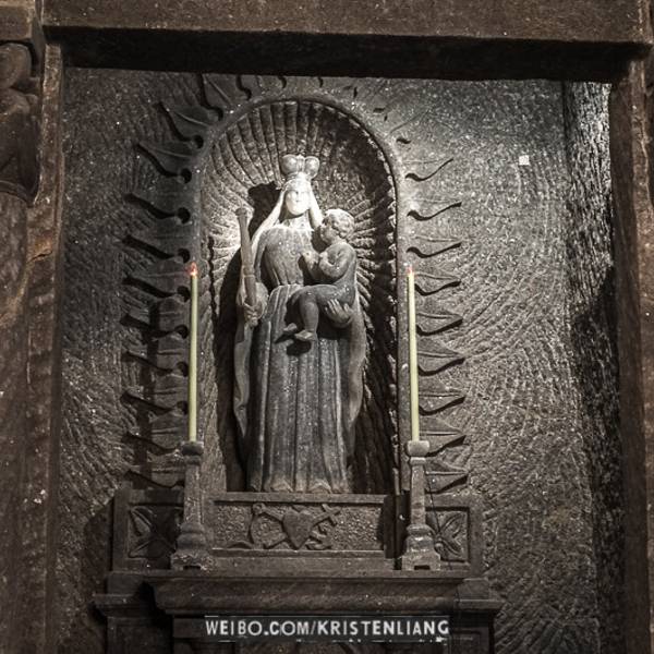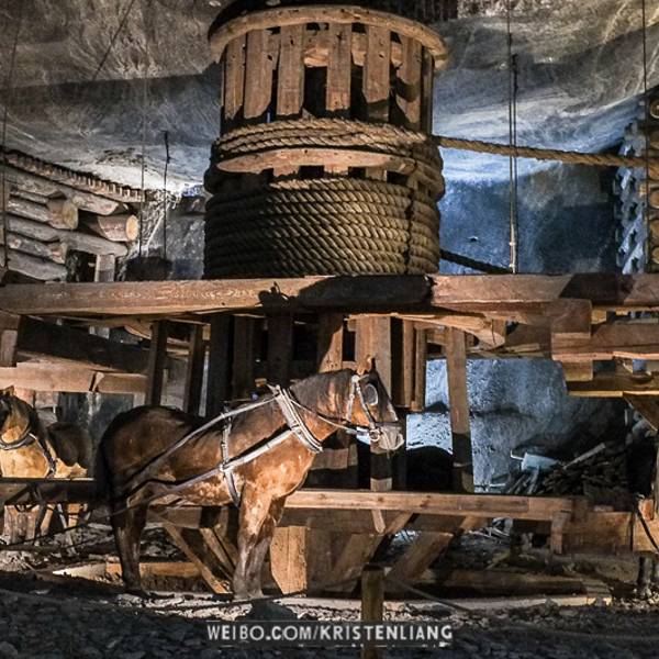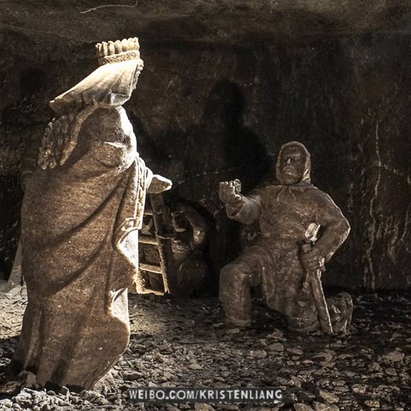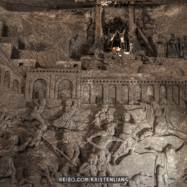 并不似想象中的潮湿阴仄,白色圆木支撑着长长的隧洞,看上去洁净整齐,常年恒温14℃,连空气也是清新纯净的。年代久了,有些圆木中间还渗出白色的盐状晶体。偶尔裸露的墙壁,乌黑光滑却又凹凸不平,舔一舔,嗯,还真的是咸的!在这个地下王国,一切想象都变得苍白无力,这里有房间、餐厅、礼拜堂、博物馆,以及各种精美的雕塑壁画,甚至还有宁静而幽谧的地下盐湖。穿梭于盐矿的每一个角落,听向导讲述这里曾经的辉煌,盐制的雕塑不断模拟出当年矿工们工作、生活的场景,——先把盐从墙壁上挖掘下来,然后就地研磨,再用水炼制出精盐,由马匹搬运回地面,就这样周而复始、源源不断的提供食盐。如今看来普通的盐,在中世纪曾贵如黄金,而盐矿,正是当时波兰王朝主要的财政来源。
