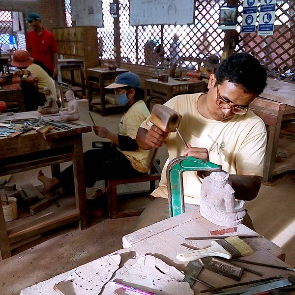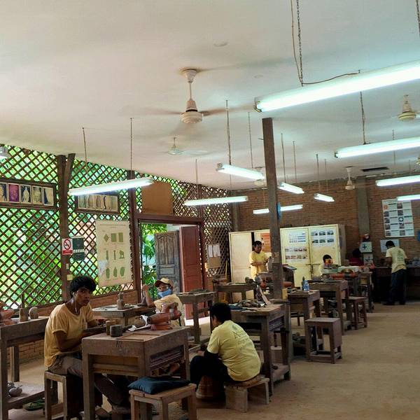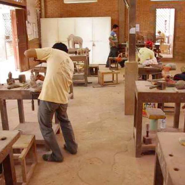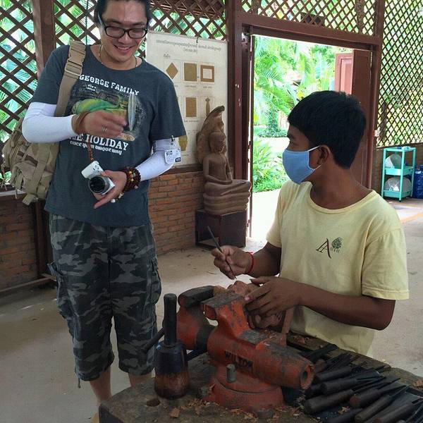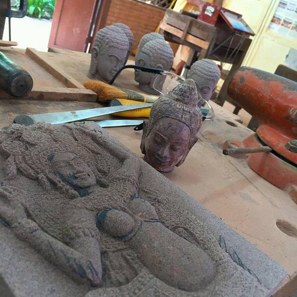 柬埔寨人民生活贫困,教育文化推广工作都要靠外援。为协助传承柬埔寨传统工艺,欧盟国家在暹粒市成立“Artisans D’Angkor”艺术学校,专门招收孤儿和贫童,每月支付10美元让他们专心学习传统技艺。学校采开放式解说,游客也可在展示馆选购纪念品,尽管价格比旧市集贵上几倍,但雕工较精细,质感不能等同相比。除了石雕,当地丝织艺术也非常发达,在暹粒市外另有蚕丝学校,展示馆内也陈列许多丝绸服饰,改良柬式纯丝衬衫,一件18美元,机场也设有专柜。