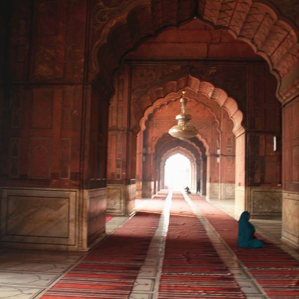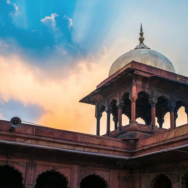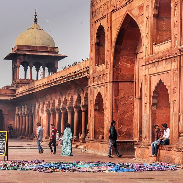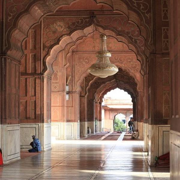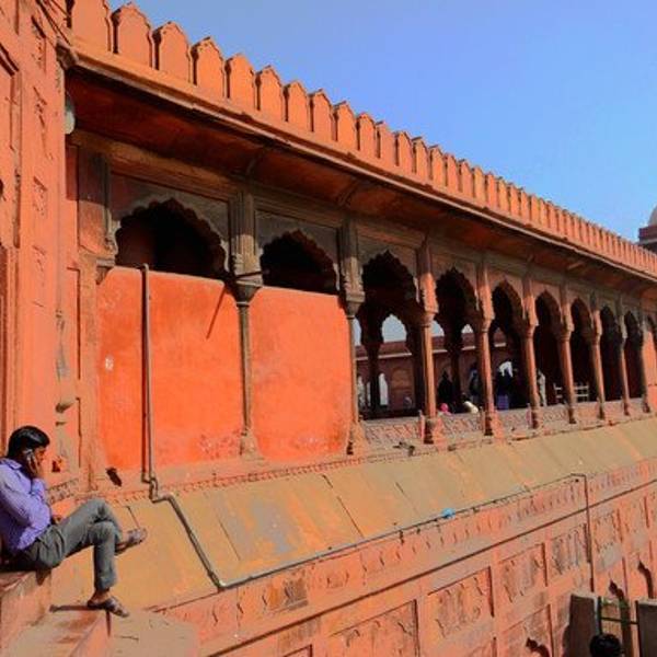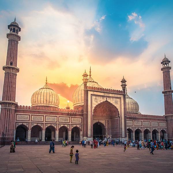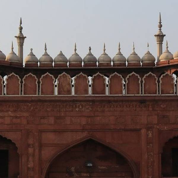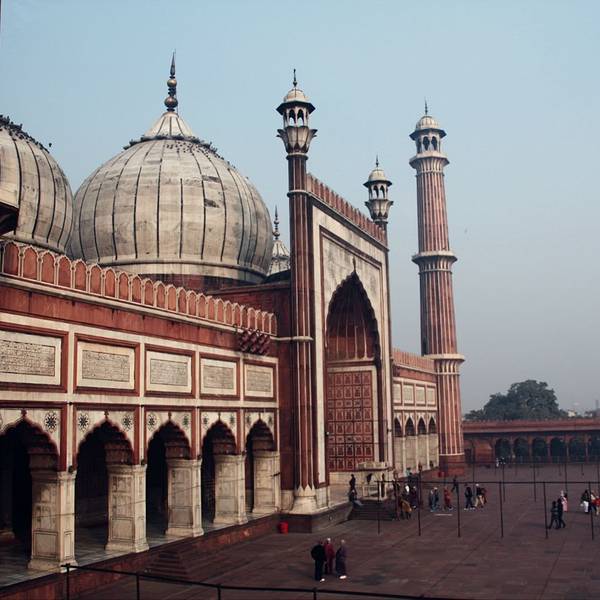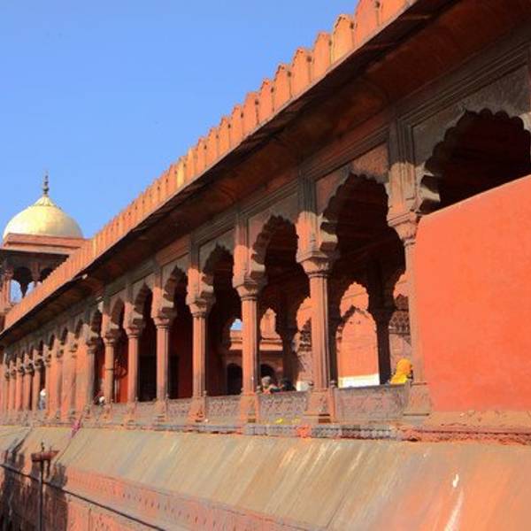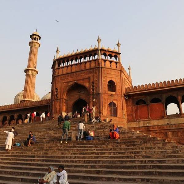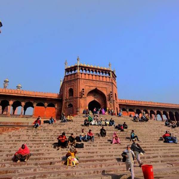 贾玛清真寺是印度最大也是最有名清真寺,由设计泰姬陵的沙贾汗皇帝督造,耗时6 年,于1656 年竣工,地处月光集市东南,与德里红堡隔街相望。清真寺占地超过1200 平方公里,是今日老德里的伊斯兰文化中心。清真寺有三座大门,最主要的是红堡正对着的东门,它是当年供皇室成员使用的大门。寺中有两座高40 米的宣礼塔,南侧的一座对游人开放。在虔诚肃穆的氛围中,登上宣礼塔俯瞰周遭美景是不可错过的体验。需要注意,进入观礼塔顶层需要脱鞋,而且女子独自一人禁止入内。包括贾玛清真寺门口的广场和四围的长廊在内,整个建筑最多可容纳25000 名信徒同时进行祈祷。因此,在人潮高峰期,请游客服从管理安排,切勿打扰祈祷仪式。参观清真寺不需要门票,但如果需要在内摄影得交纳300 卢比的相机门票。