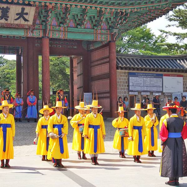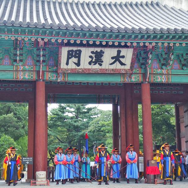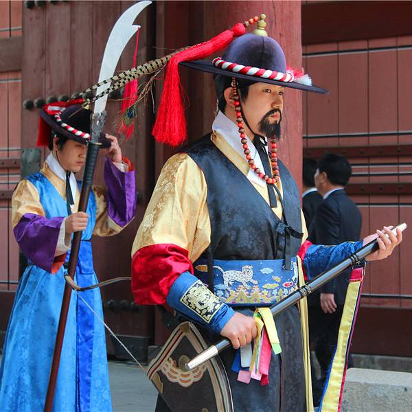 “王宫守门将交接仪式”是重现朝鲜时期(1392年-1910年)在王宫负责开关宫门、守卫及巡逻任务的守门将士的守卫仪式和交接班仪式。除了周一,每天三次在德寿宫(朝鲜末期所建宫殿)正门——大汉门前举行。