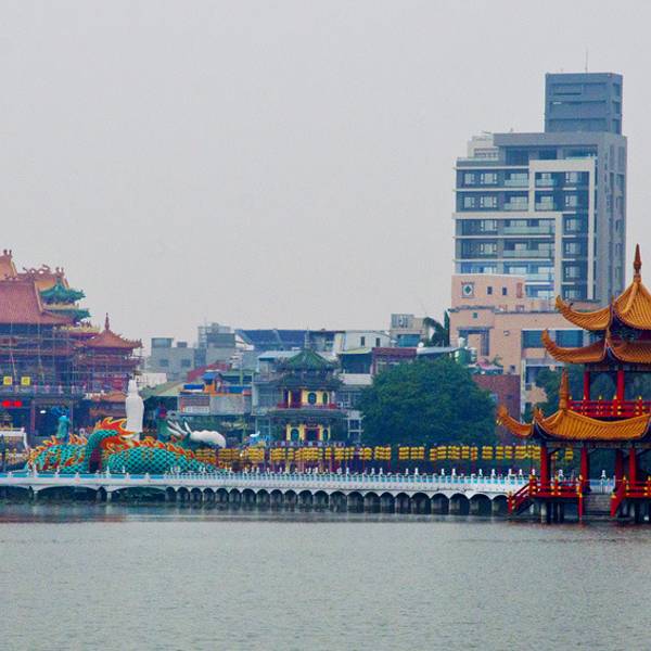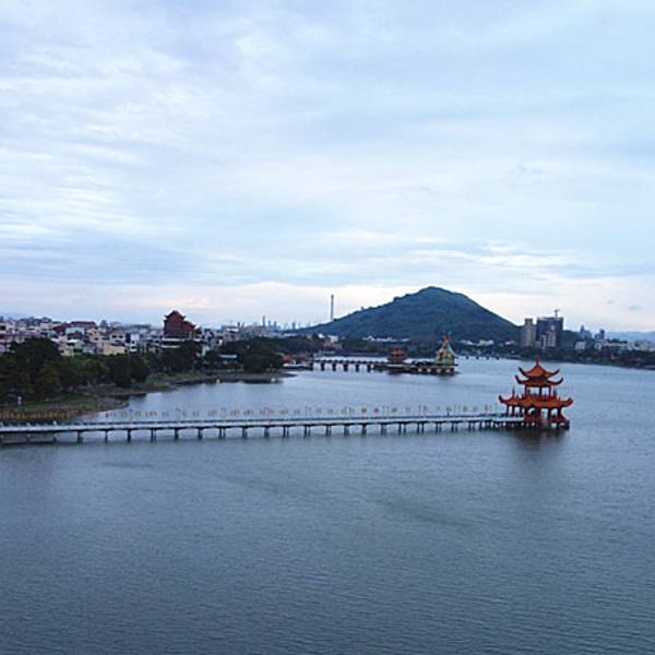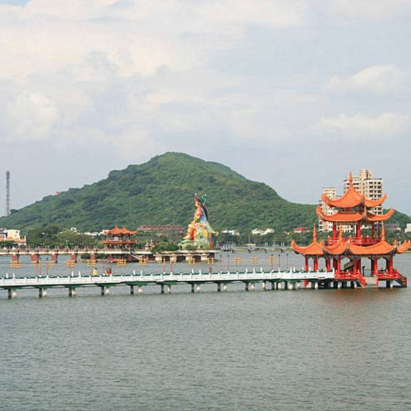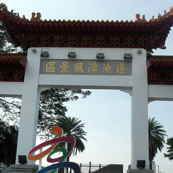 莲池潭,旧称莲花潭,位于高雄市半屏山之南,龟山之北。莲池潭潭长1.4公里,因清朝时期潭种满莲花,到了夏季清香四溢而得名。莲池潭景区莲花潭西岸庙宇林立,500公尺内拥有20余座寺庙,由北而南的景点分别如高雄孔庙、春秋阁、启明堂、五里亭、龙虎塔等。长桥、艺阁、宝塔、色彩浓重,为莲花潭增添不少热闹景象,形成左营地区有名的寺庙观光区。西岸也是左营的旧市街,非常热闹。同时,莲池潭的东岸为宽敞的环湖道路,南岸则由胜利路及新莊仔路所衔接,恰好形成了一个完整的环湖道路。每当晨昏时,莲池潭水雾蒙蒙,池畔景色秀丽若隐若现,有一种难以言喻的神秘感。尤其是甘雨润泽的夏季,潭水盈盈,波光粼粼,加上湖畔的垂柳摇曳,潭面的浮萍与水莲逐风飘荡,画面之美如置身于西湖之中。如果要游览完莲池潭周边的所有景点可能需花上半天或者1天的时间,对于游客来说,基本上就是游览一下西岸的几个重要庙宇,景点相对比较集中,步行也不会觉得太累。龙虎塔塔高七层,潭水上立有龙虎两孪生阁楼,楼前各有龙虎塑像,游客可以身为道,由龙口进,虎口出,取其吉祥之意。龙塔内画有中国的二十四孝子插图,虎塔则画有十二贤士图。塔身与岸边有九曲桥衔接,巍峨耸立,与潭面相互对应,景致优美。虎口和龙口是游客们争相拍照留念的地方。春秋阁从龙虎塔往前走就是春秋阁和启明堂。春秋阁为两座中国宫殿式楼阁,为春阁及秋阁之合称,各为四层八角,绿瓦黄墙,宛如宝塔,古色古香的塔影倒映水中。各有九曲桥相通,又称“春秋御阁”,系为纪念武圣关公而建。春秋阁的前端有骑龙观音,地方相传观音菩萨曾骑龙在云端现身,指示信徒要依其现身之形态建造圣像在春阁与秋阁之间,故有现在的骑龙观音圣像。在圣像的前面有一个小池子,里面养了数百只乌龟,形态各异,不知道的还以为是假的雕塑。春秋阁的旁边就是启明堂,又称东南帝厥大殿,为莲池潭畔雄伟的寺庙。在春秋两阁曲桥的正中间,另建有一座长桥往潭中延伸,尽头处的三层式亭阁即为五里亭,站在亭内可以拍摄对面龙虎塔的全景。孔庙再沿着潭边的步道往北走,就是孔庙,这是一栋仿北方宫殿式的建筑,建筑宏伟堂皇。内部包括大成殿、大成门、东西庑、崇圣祠、棂星门、礼门与义路坊、明伦堂与泮宫坊、万仞宫墙、泮池与拱桥等,建筑完备。可以在这里为孩子祈福学业。