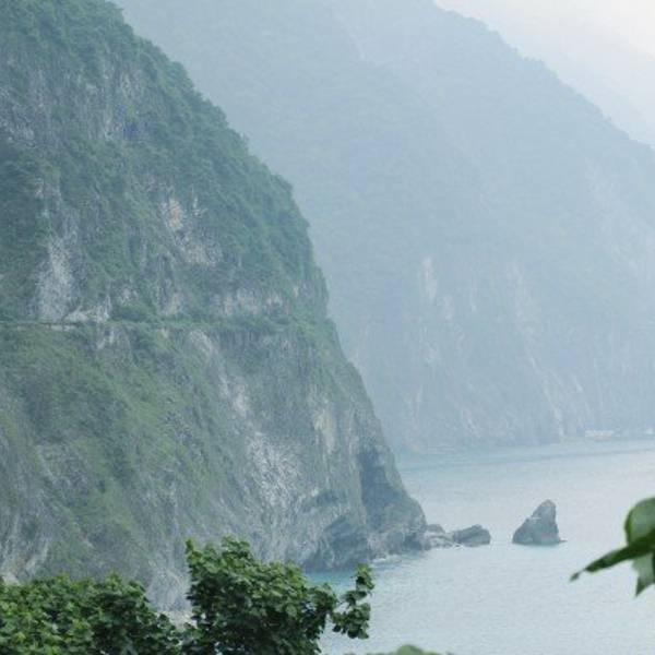 过了和平隧道,往车窗外看,悬在半空中的道路,夹杂着层层的悬崖和峭壁。一路上,全都是片麻岩和大理岩,壮阔的景观令人感到敬畏。苏花公路皆有如一条上不着天、下不着地的空中走廊,镶嵌在狰狞的大理石崖壁上,观此奇景,令人不禁赞叹。