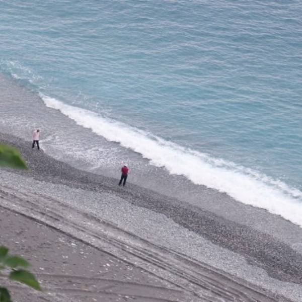 往下看,崖底有细细的一条海滩,在台湾,很少见到沙滩,大部分的海岸不是巨大的礁石就是被海水磨成的小石头。如果在断崖处时间够长,可以走到下面戏水,会很好玩。