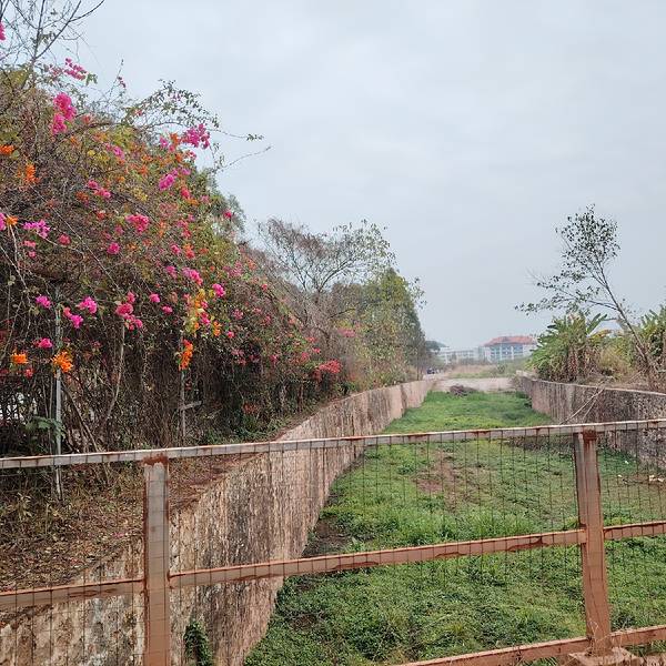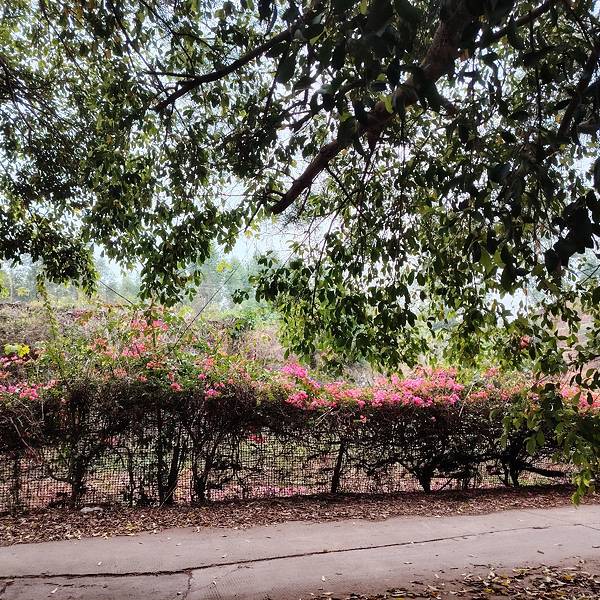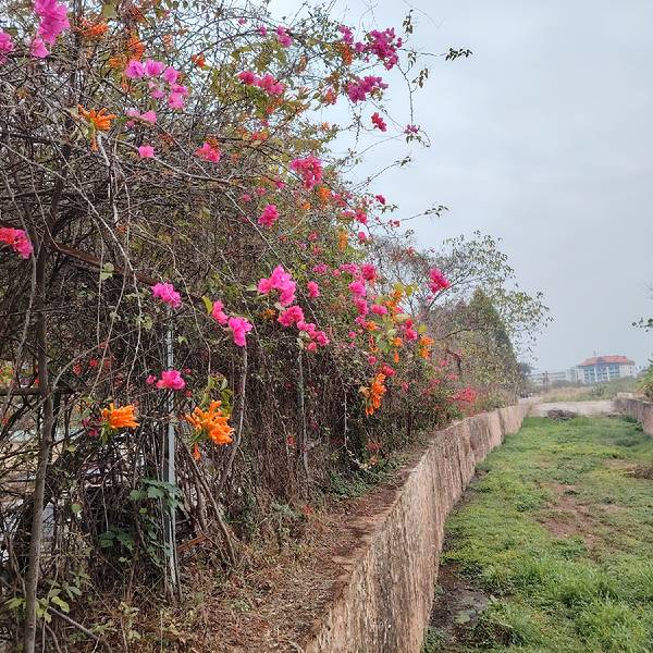 很多时候,走路才能看到不同的美景。 所以从小路走进南宁金沙湖景区,看到了湖的大坝闸口,闸口下长满草,闸口周围长满三角梅,挺漂亮的。