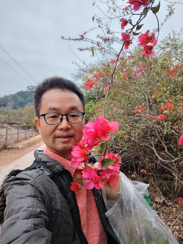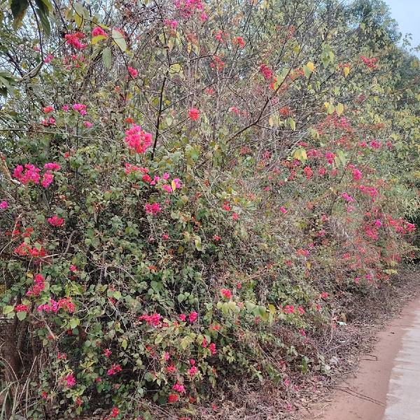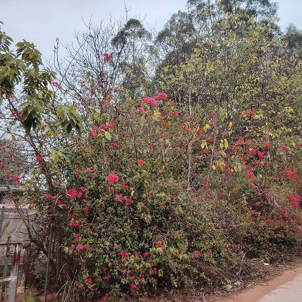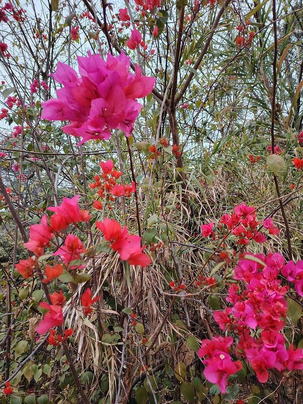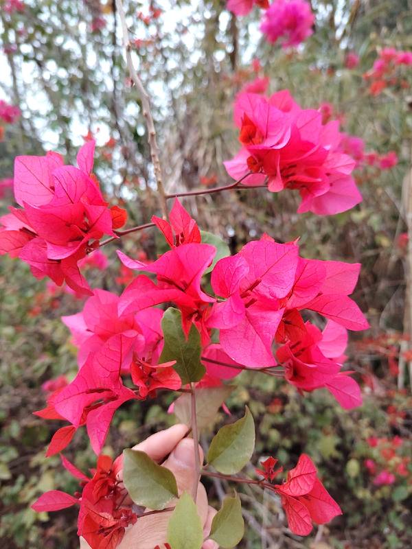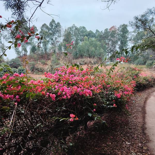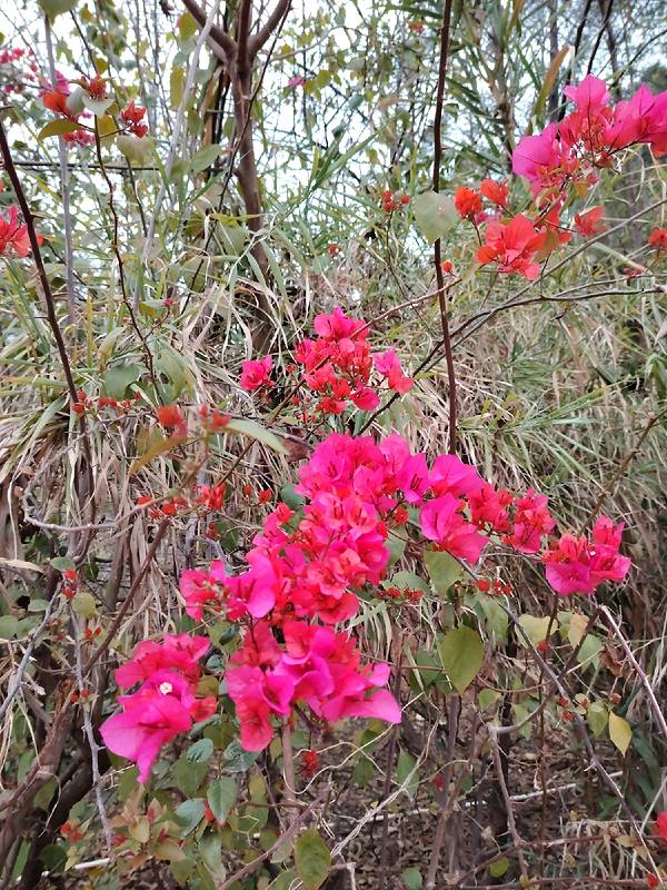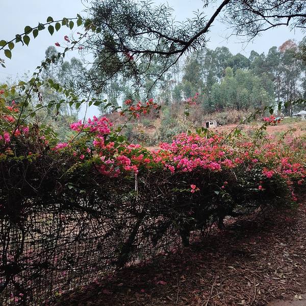 春天的南宁,三角梅盛放,到处都看得到。 这一片红花是在金沙湖亲水休闲园旁边,从这里到湖边很近,我要坐小船到对面岛上的岭头凰竹盐鸡养殖基地吃饭。