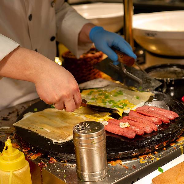 我们当天的中餐,以及第二天的早餐,都是在哈尔滨香格里拉大酒店一楼的咖啡苑自助餐厅吃的。自助餐的食材和用餐环境都还不错,服务也很好,一些限量菜品会送餐到桌。人均两百出头的自助餐,性价比挺高的,如果配合银行卡活动,价格还能更低。哈尔滨烤冷面、煎饼果子、东北烤串、韭菜盒子、现包现做的十八个褶子的大包子……,别以为这样烟火气息的小吃得去路边摊找,哈尔滨香格里拉大酒店的咖啡苑自助餐厅,提供全天候就餐服务,除了有丰富的中西风味佳肴,还有许多东北特色的美食和小吃,味道都很正宗。