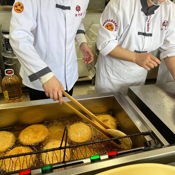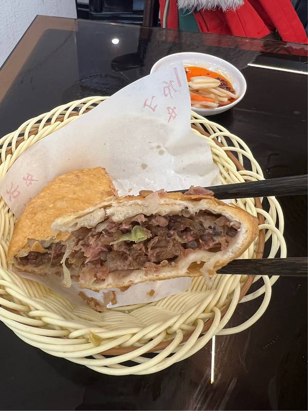 以前来吃过一次,是另外一家店。这次叫辆车,在地图上找了最近的一家店,竟然是总店,真是幸运。 店里人很多,需要先买票再自取餐食。 精品胡辣汤是必吃的,有人说他家的味道外地人不一定吃的惯。但我们感觉还行,就是有些辣,不过是真的开胃啊。 葱油饼非常好吃。卖相也很好,下锅炸、刀切、装筐的过程如行云流水,看着就是一种享受。味道就更不用说了,酥脆可口,而且香气袭人。掰碎了泡在胡辣汤里,味道更好。 牛肉盒比起上两个菜就显得有些一般了。