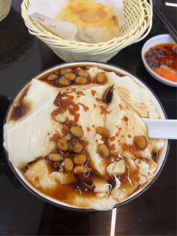 豆腐脑 4元,很大碗,甜咸两种,甜的就是加白糖。比厦门挑担子卖3元一杯的量得有3个3元那么多的量。
