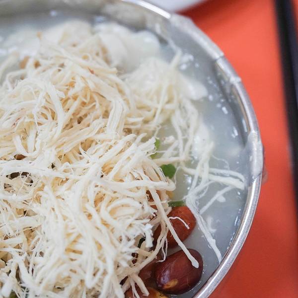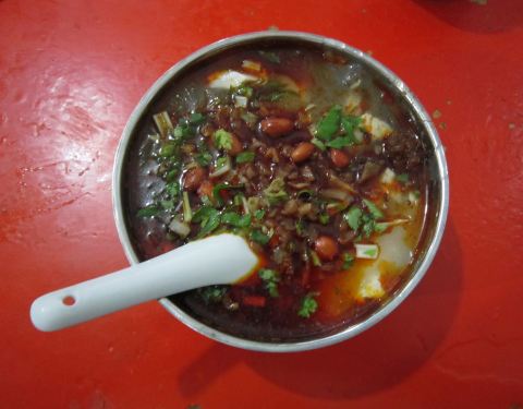 豆腐脑是乐山必吃的小吃之一,这家属于老字号的店,生意很好,外地游客有时候会吃不惯,是因为不太了解本地的饮食习惯。乐山的豆腐脑里面豆腐其实很少,主要是牛肉汤做的半粘稠汤汁,加上粉条、花生、豌豆、芹菜、大头菜粒等做成的一道小吃,重点是吃汤汁的味道。
