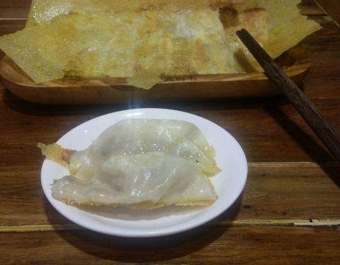 韭黄牛肉锅贴饺子,锅贴底部非常酥脆,端上来热气腾腾,很好吃