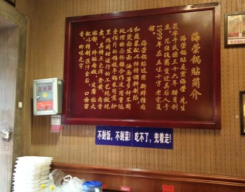 海荣锅贴是西安市老字号餐饮企业,創建于1947年,也是中华特色美食企业。经营的锅贴主要有5种,有牛肉韭菜,三茹蔬菜,大肉三鲜等。价格不高,口味可以。