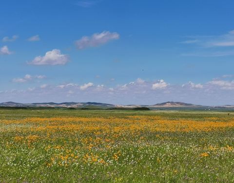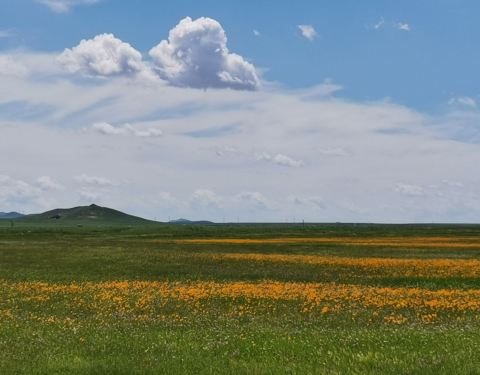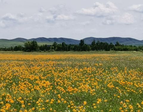 在金莲花盛开的季节来到这里,带着对家乡特有的情感,看到的美美的草原浓浓的情。我爱这片草原。