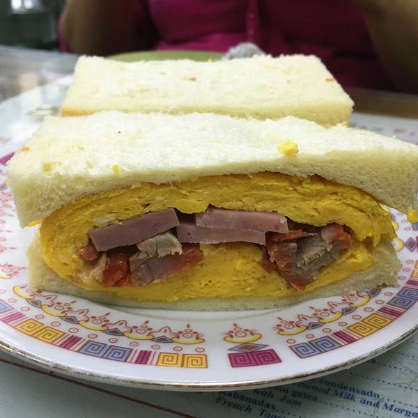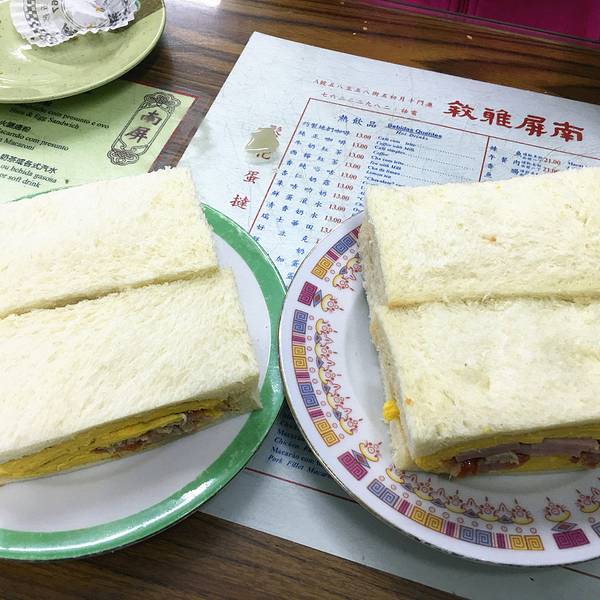 南屏雅叙是个很有历史的地方,是澳门老字号的茶餐厅。不能错过的南屏文治,炒蛋配多汁的叉烧和火腿,上下的面包是没有烤过的,炒蛋的热度温热了面包,口感很好。