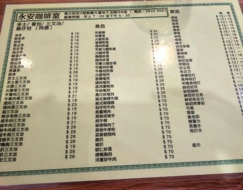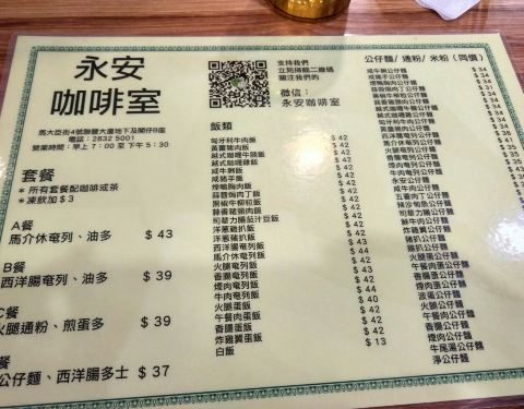 永安咖啡室,常常光顾的茶餐厅这里的食物都是现点现做,如黑椒牛柳粒及蒜蓉焗肉丁等,因此食物味道非同一般,十分惹味,即使搭配公仔面也毫不逊色。除此之外,马介休奄列也不错,#马介休# 作为葡国菜,和出前一丁搭配竟一拍即合,是独具特色的美食。午餐不知道吃什么,可以来这里试试,体验一下澳门打工仔的日常美味。