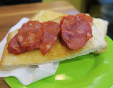 菜单拿起来没一个看得懂,我们就随便点了个套餐,套餐有附一杯茶或咖啡。菜单搭配着送上来的餐点,可想而知第一样就是公仔面。公仔面外表平淡,味道不会过咸或太淡,意外的顺口,下次如果有机会回访,会点有变化的公仔面试试。再来这个就是西洋肠多士。香肠+吐司的概念,香肠偏咸,搭配土司吃刚刚好,吐司烤得酥脆。