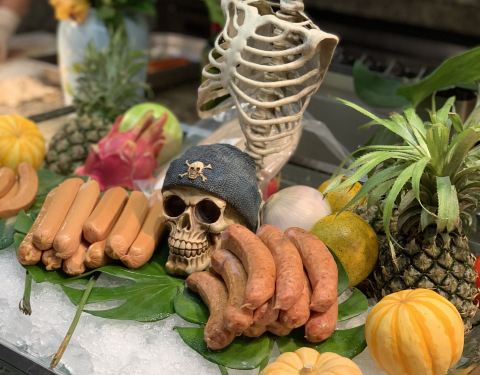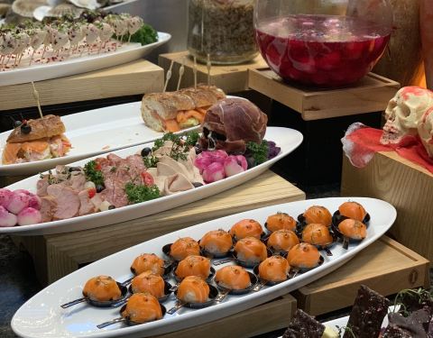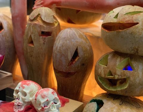 虽然不是我们自己的节日,但是因为正好在这边吃自助,整个氛围都是万圣节,那就一起感受一下吧!不得不说高端酒店的自助餐厅,确实蛮不错的呀,而且氛围布置很到位,整个大厅全是小南瓜,哈哈哈哈哈,吃完还可以带走,很可爱的哦! 特别是里面的牛排那里,好多万圣节的骨头~~哈哈哈哈,看上去是不是有点小紧张啊,有点恐怖啊,其实都是摆设啦!制作真的是超级逼真! 当然甜品区,更是最特别的啦,整个甜品的糕点全部都是万圣节的一些特别玩偶制作的,小精灵、骷髅、跳跳玩偶、血痕等等,真的是蛮有意思的啊,一口下去感觉最都红红的,血盆大口啊,哈哈哈哈哈!
