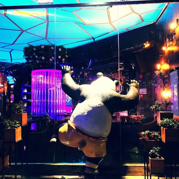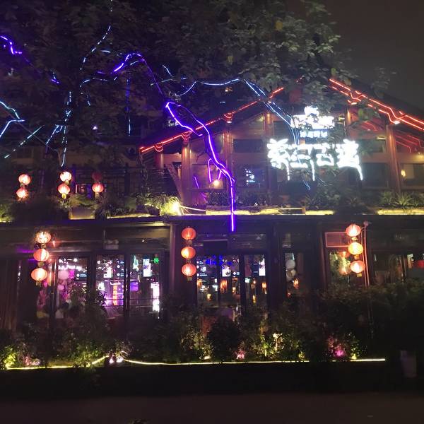 安顿好行李,趁着成都这么舒服的空气拍打我身,决定先在小区周边散散步,慢悠悠的走过几个街口,大约十几分钟便到了传说中的九眼桥酒吧街,据说这里晚上九点以后会特别热闹,一家一家连着的酒吧,各自施展魔法。可是到达九眼桥的时候,霓虹初上,酒吧里空空如也,每一家酒吧的服务员都在紧张的准备中,迎接夜晚的狂欢,而此时这条街安静如常,下班的人群和晚饭后遛弯儿的大爷大妈们穿梭于此,就像旁边静静流淌的府南河,来了去,去无踪,各自在各自的轨道上,互不打扰,各安其事。据说九眼桥酒吧街是这里最著名的一条酒吧街,大大小小不同主题不同装修风格的酒吧有上百家,沿河而建,霓虹闪耀、眼花缭乱,。我没有在此逗留,也没有等到它们暮色深沉之时的狂欢,是因我不胜酒力又牵肠挂肚热辣辣的成都火锅,于是匆匆离去。我说成都的夜是多情的,有时迷幻,让我想起了林忆莲的《夜太黑》,“霓虹里人影如鬼魅,这城市隐约有种堕落的美。”不知向左或向右;有时伤感,就像《白天不懂夜的黑》,“你永远不懂我伤悲……不懂月亮的盈缺。”有时它会随着音乐的节奏欢快舞动,有时它又会透着那么一股淡淡的柔情……一首成都,一杯酒,一条河,对酒当歌一场梦。