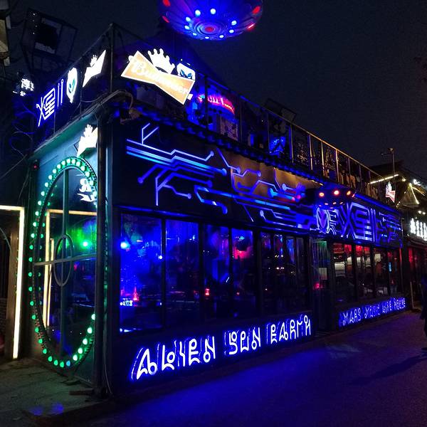 总以黑灯瞎火的场景为主调,各种主题均是。每个点门口都站着几个人,拉客,有的还一直尾随你,跟着你后面各种唠叨着!几十名防暴队员,准点在这集合上岗,棍叉盾牌都有。其实喝酒哪里不能喝,在家里最好造出来的就是酒吧氛围,买最好的青岛一厂出的生啤,搞点音乐,也学着把灯关了……到酒吧去的人多数不为酒,也不为音乐,为的就是那素不相识的陌生人,如果酒吧里没有陌生人,肯定没有人愿意去,可见陌生人也是一种资源。