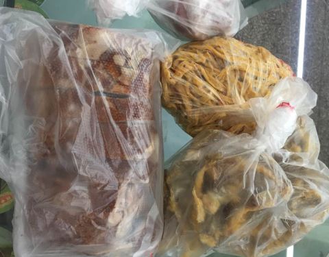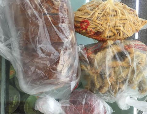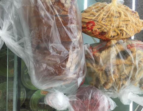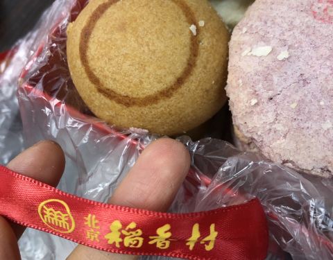 经由老北京介绍,特地来稻香村买名产,还没进门就看到长长人龙在排队买炸肉串,跟风买了一串,排前面的人一听到我只要买一串,还拉高声调怀疑的问是否真买一串,原来大家都一大把的买,味道很香。