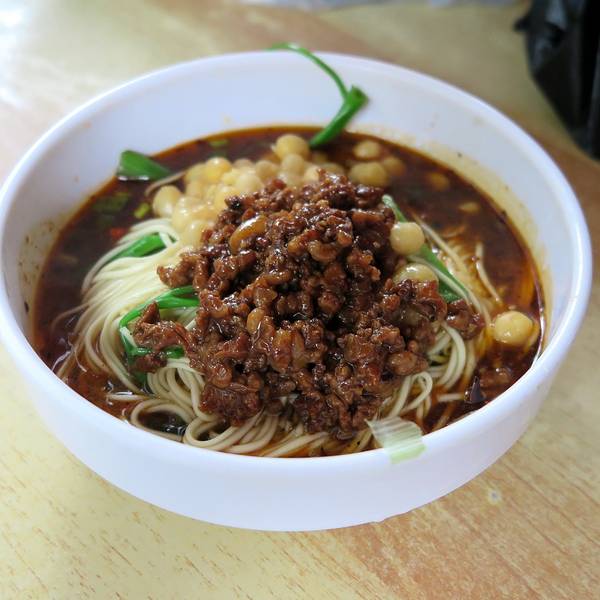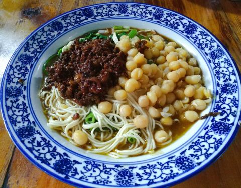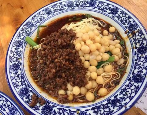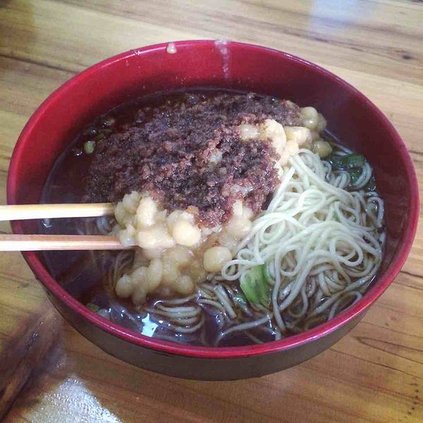磁器口美食街对面全是小餐馆,各种重庆特色的小吃,因为突然下起了阵雨,随便躲进这家来吃个面,其实也是看过别人说好吃。 点了个2两的碗杂面,果然量大,好大的一份,象盖浇面一样,细细的面上铺上了杂酱和豌豆,拌均匀了,豌豆很酥烂,酱汁慢慢透进面条,略有嚼劲,让一个不会吃面的人一口气吃掉了一半,店内的服务员态度都很好。