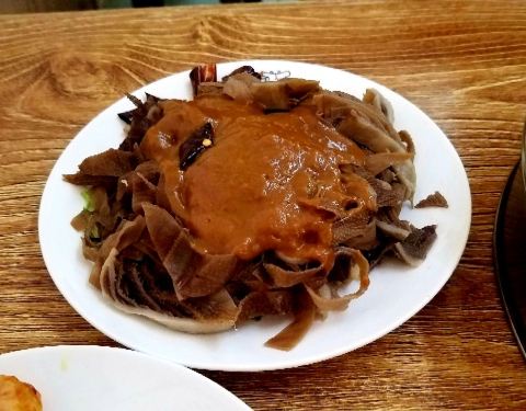 店面不大,招牌也不是特别显眼,不熟悉单行路怎么走的最好导航去。看了美食推荐的帖子特地过来试试。上次六点半到的可是店家已经关了门,这次提前到了电话,老板说通常八点才闭店,肯定吃得上。点了排名第一的茶树菇烧麦,怕不够吃又点了一笼蟹黄烧麦,但是最后强吃着还是各剩了一笼...烧麦太大只了...茶树菇烧麦是招牌,确实很好吃,馅儿特别大,能看到茶树菇躺在馅儿的最底层;每只蟹黄烧麦都顶着蟹黄,不过味道略腥,不知道如果老板改良一下掺进馅儿里会不会好些。老醋花生是甜口的,很好吃,醋椒豆腐很大一锅,汤头也比较稠。老板人颜值很高,亲和力很强的天津大哥,特别亲切~
